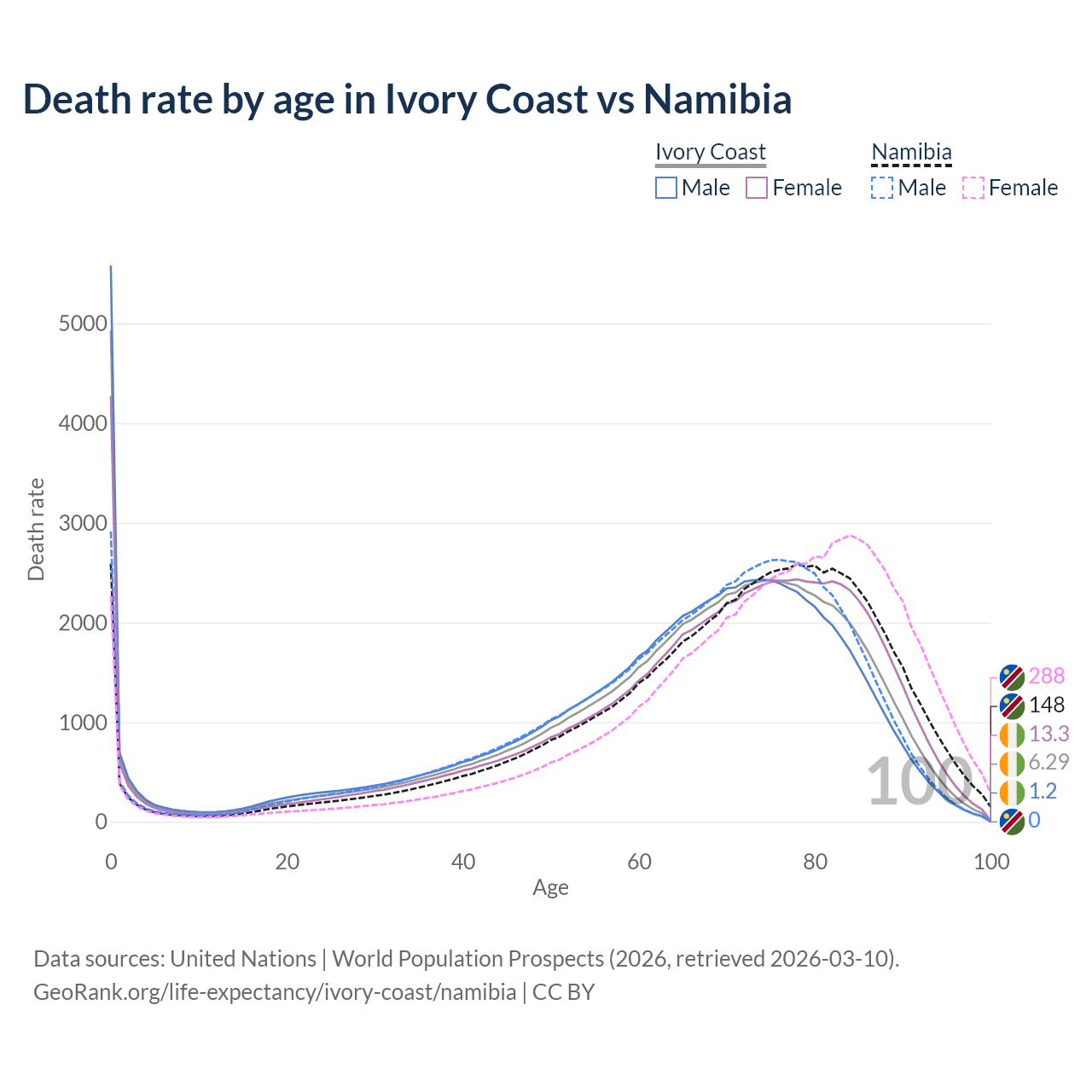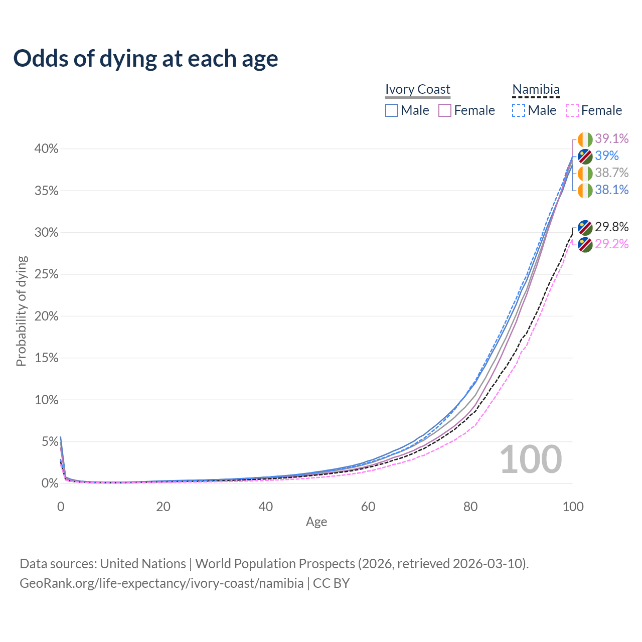 This life expectancy calculator shows the odds of living to 100, 95, 90, and below based on current age for both males and females in Ivory Coast and Namibia, along with mean and median age of death. The calculations are based on the 2026 life tables (actuarial tables) from the UN World Population Prospects.