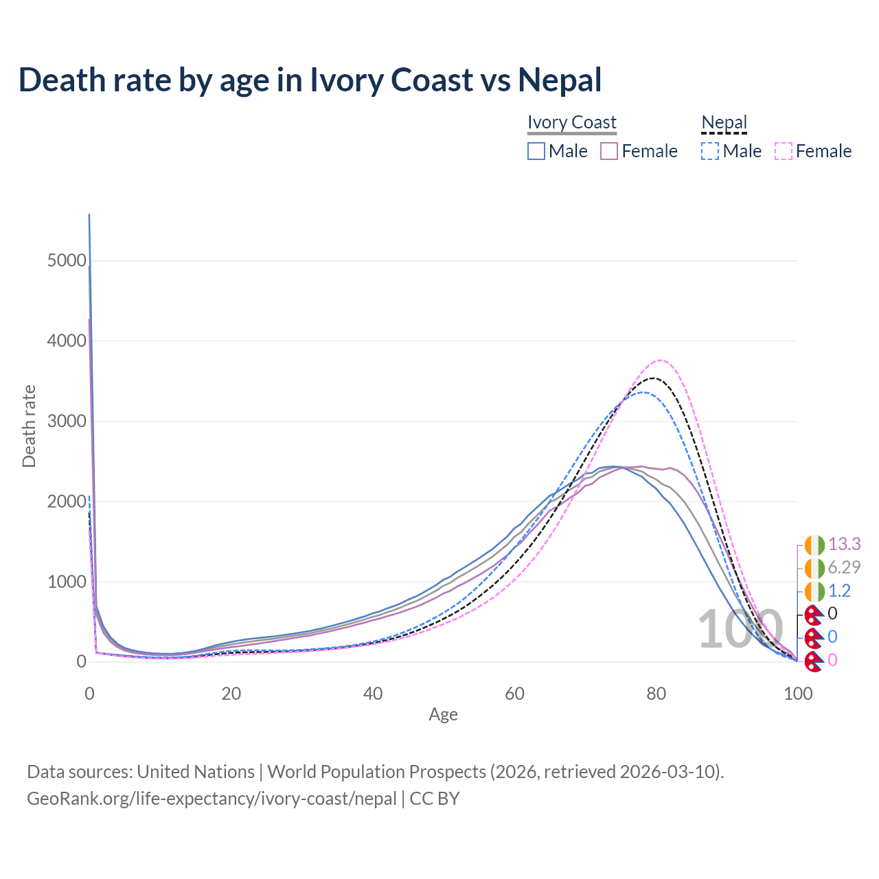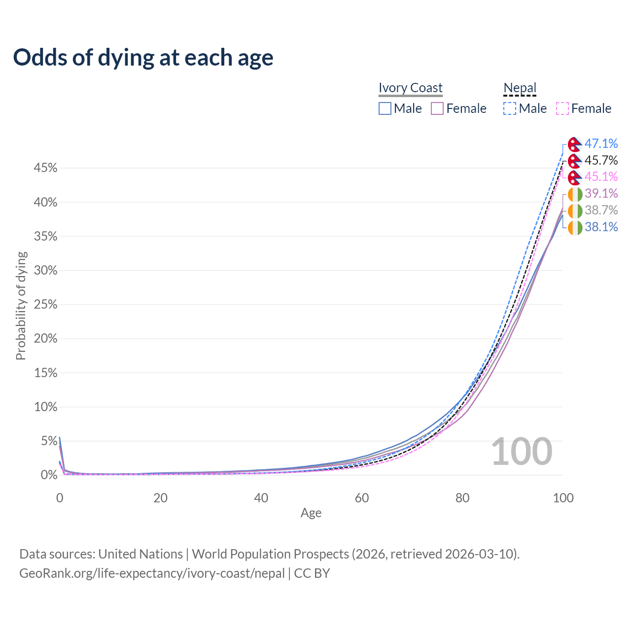 This life expectancy calculator shows the odds of living to 100, 95, 90, and below based on current age for both males and females in Ivory Coast and Nepal, along with mean and median age of death. The calculations are based on the 2026 life tables (actuarial tables) from the UN World Population Prospects.