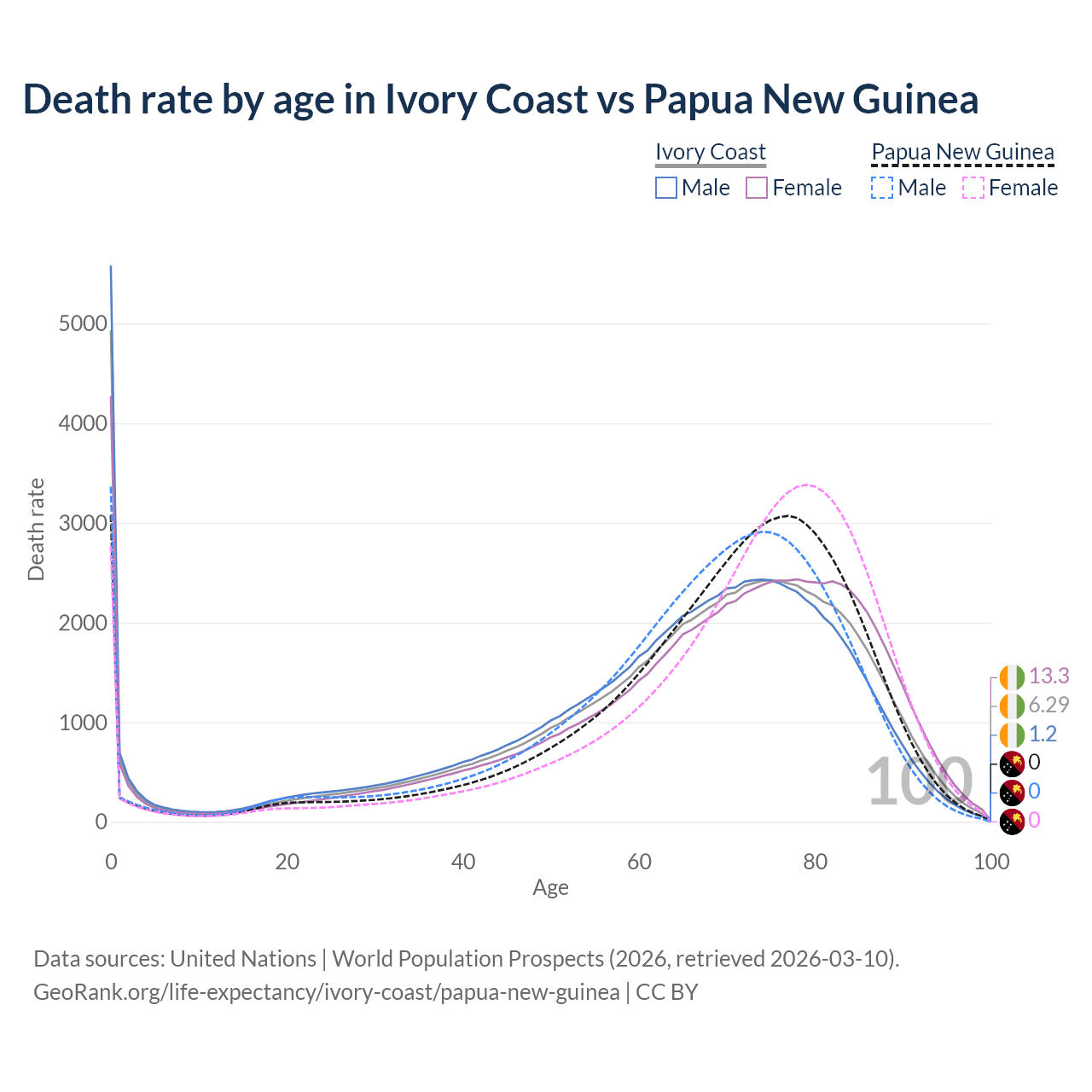 In Ivory Coast, the most common age of death is 0, compared to 0 in Papua New Guinea. The median age of death is 68.6 in Ivory Coast and 71.7 in Papua New Guinea, meaning only half of each cohort is expected to live past that age.