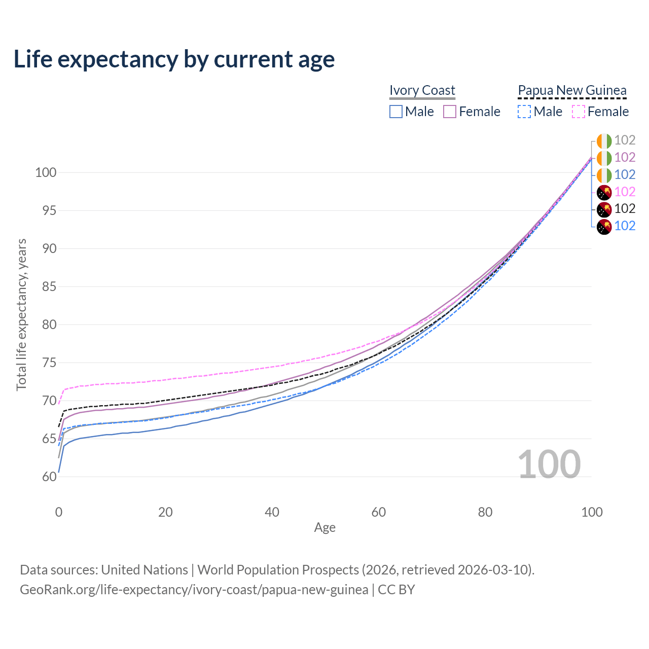 This life expectancy calculator shows the odds of living to 100, 95, 90, and below based on current age for both males and females in Ivory Coast and Papua New Guinea, along with mean and median age of death. The calculations are based on the 2026 life tables (actuarial tables) from the UN World Population Prospects.