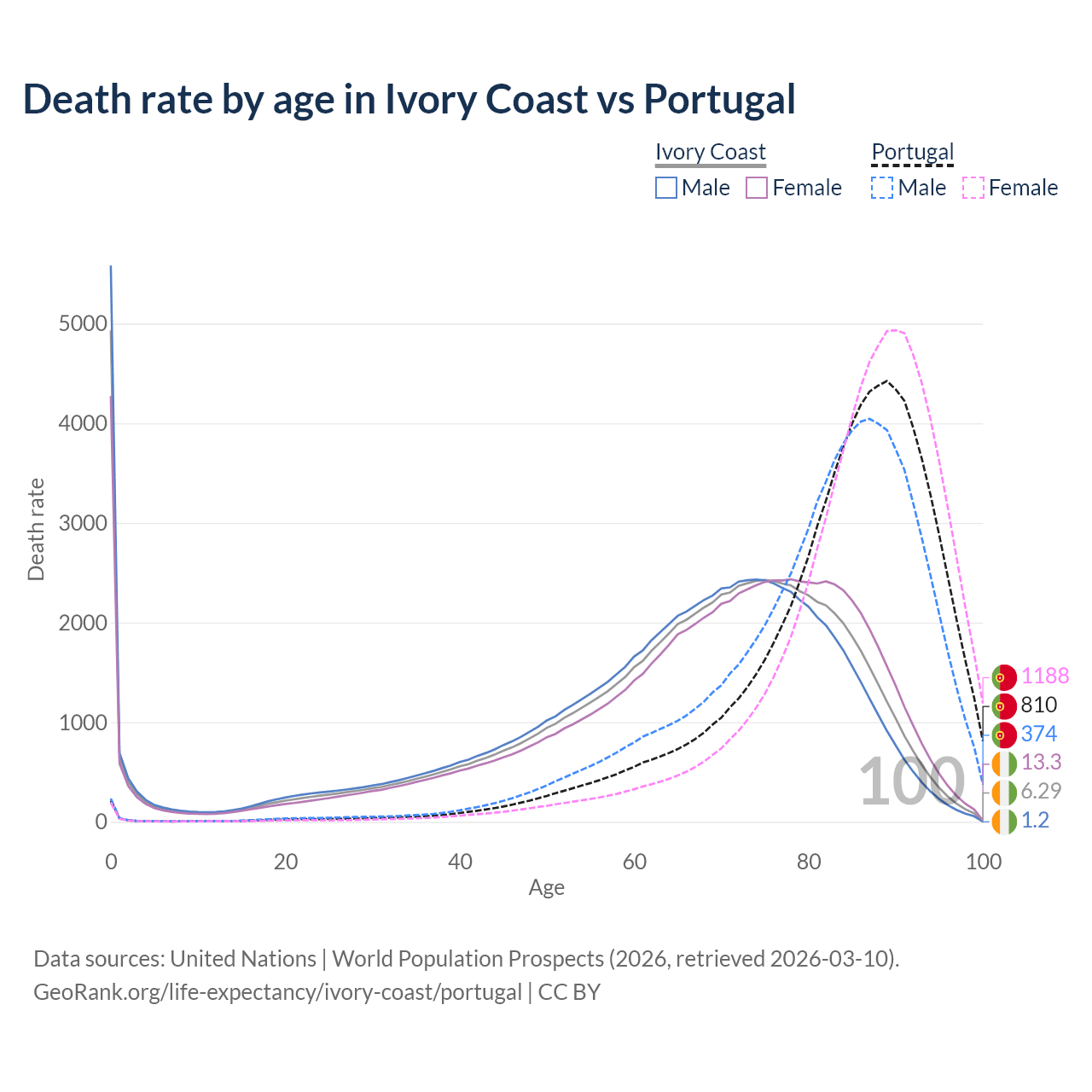 This life expectancy calculator shows the odds of living to 100, 95, 90, and below based on current age for both males and females in Ivory Coast and Portugal, along with mean and median age of death. The calculations are based on the 2026 life tables (actuarial tables) from the UN World Population Prospects.