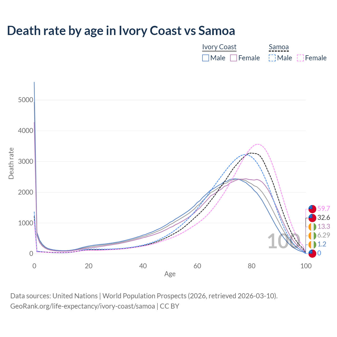In Ivory Coast, the most common age of death is 0, compared to 80 in Samoa. The median age of death is 68.6 in Ivory Coast and 75.9 in Samoa, meaning only half of each cohort is expected to live past that age.