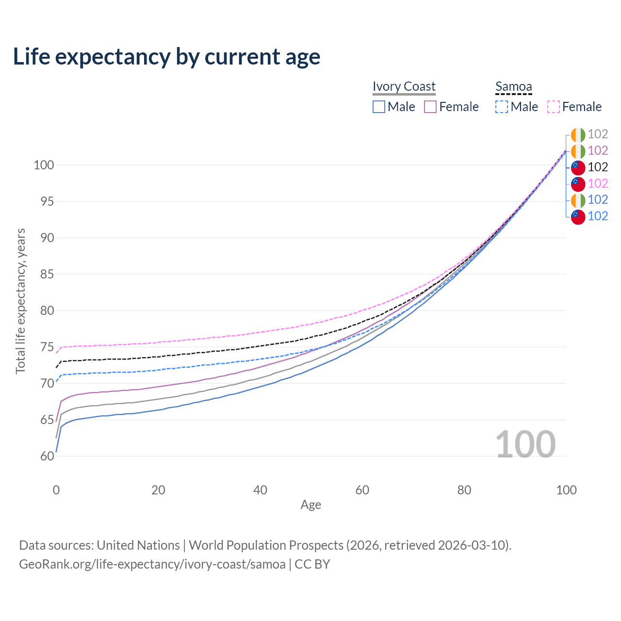 This life expectancy calculator shows the odds of living to 100, 95, 90, and below based on current age for both males and females in Ivory Coast and Samoa, along with mean and median age of death. The calculations are based on the 2026 life tables (actuarial tables) from the UN World Population Prospects.