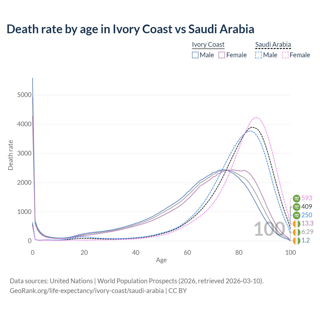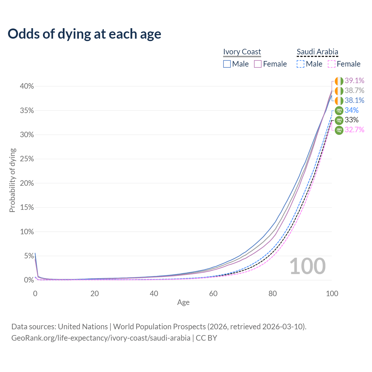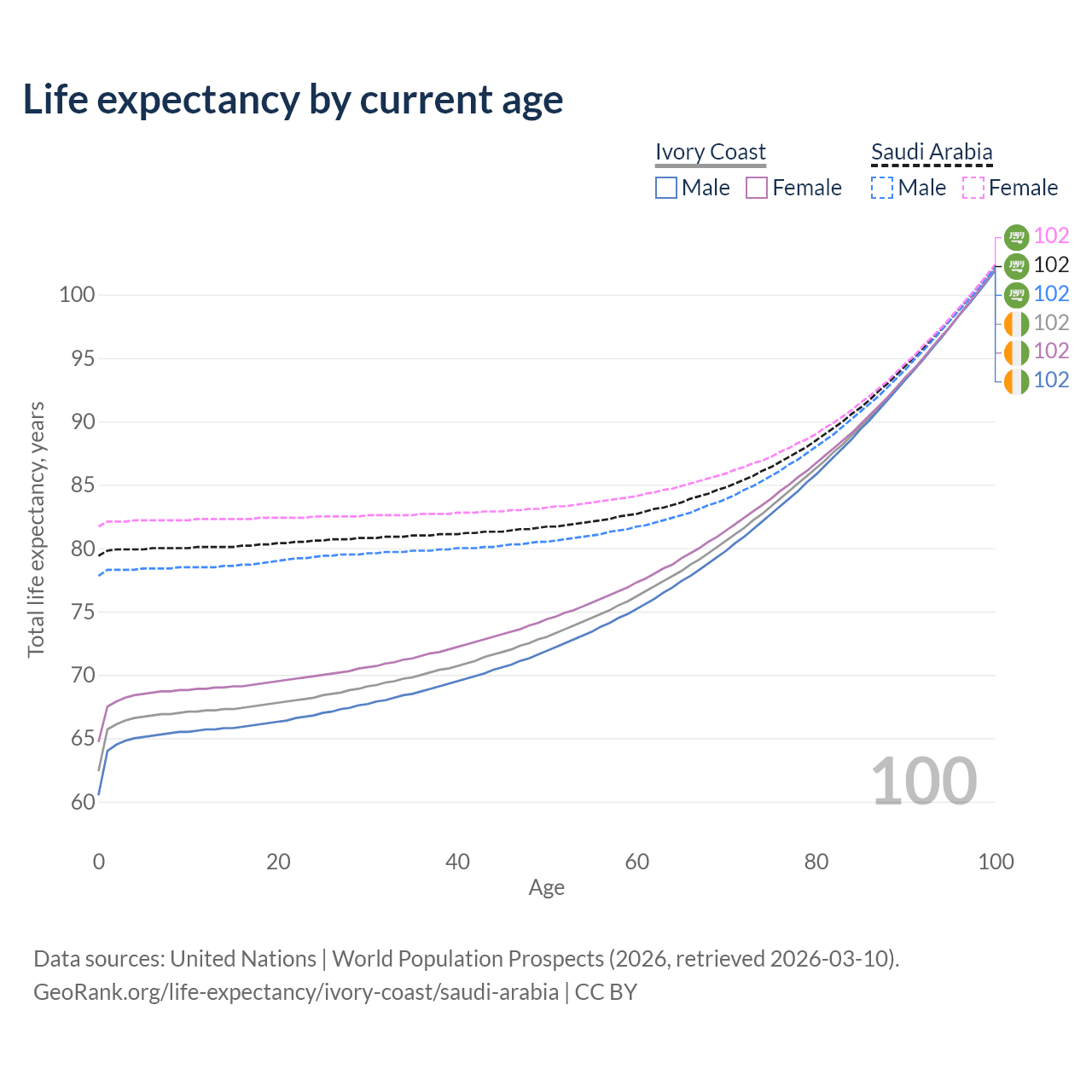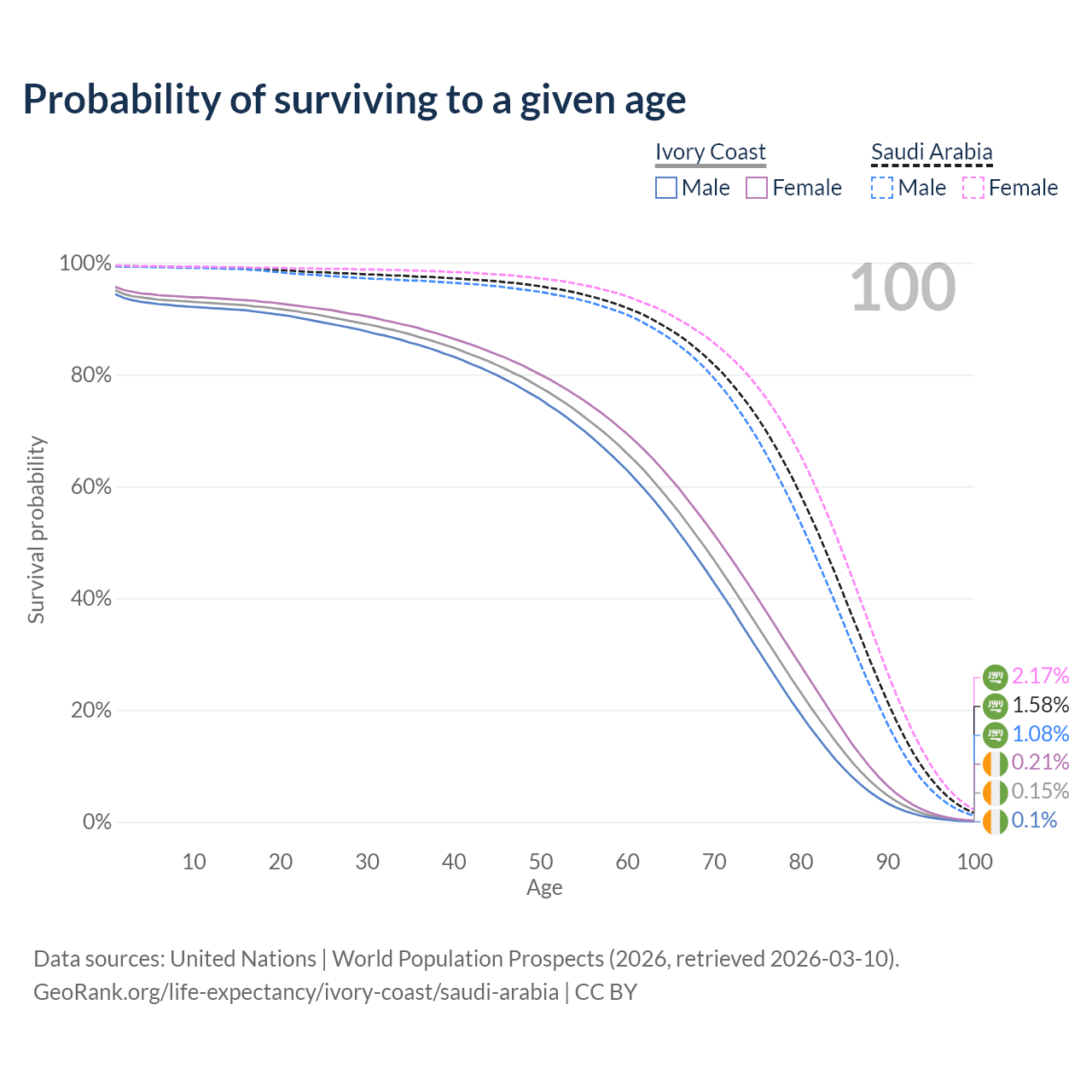 This life expectancy calculator shows the odds of living to 100, 95, 90, and below based on current age for both males and females in Ivory Coast and Saudi Arabia, along with mean and median age of death. The calculations are based on the 2026 life tables (actuarial tables) from the UN World Population Prospects.