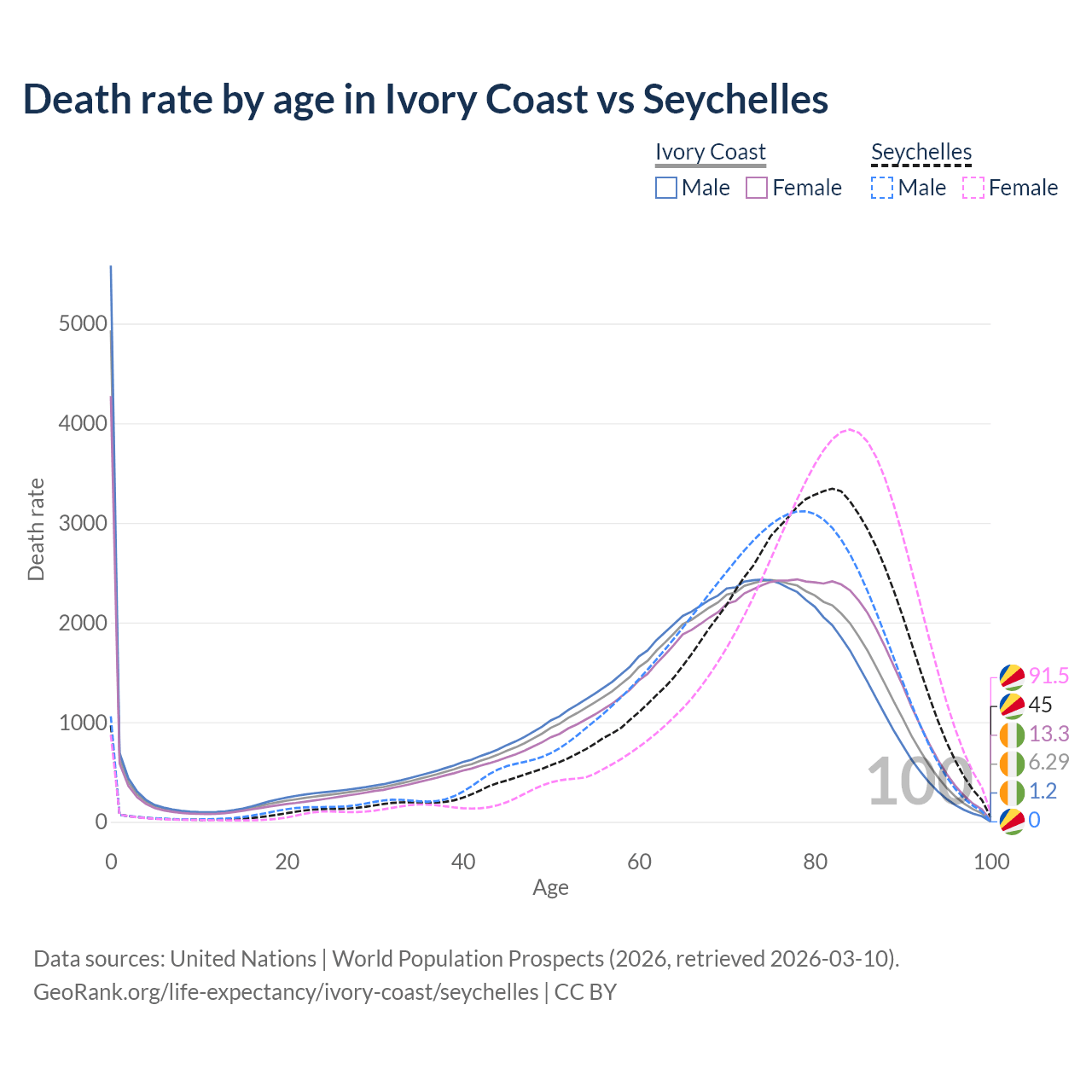 In Ivory Coast, the most common age of death is 0, compared to 82 in the Seychelles. The median age of death is 68.6 in Ivory Coast and 77 in the Seychelles, meaning only half of each cohort is expected to live past that age.