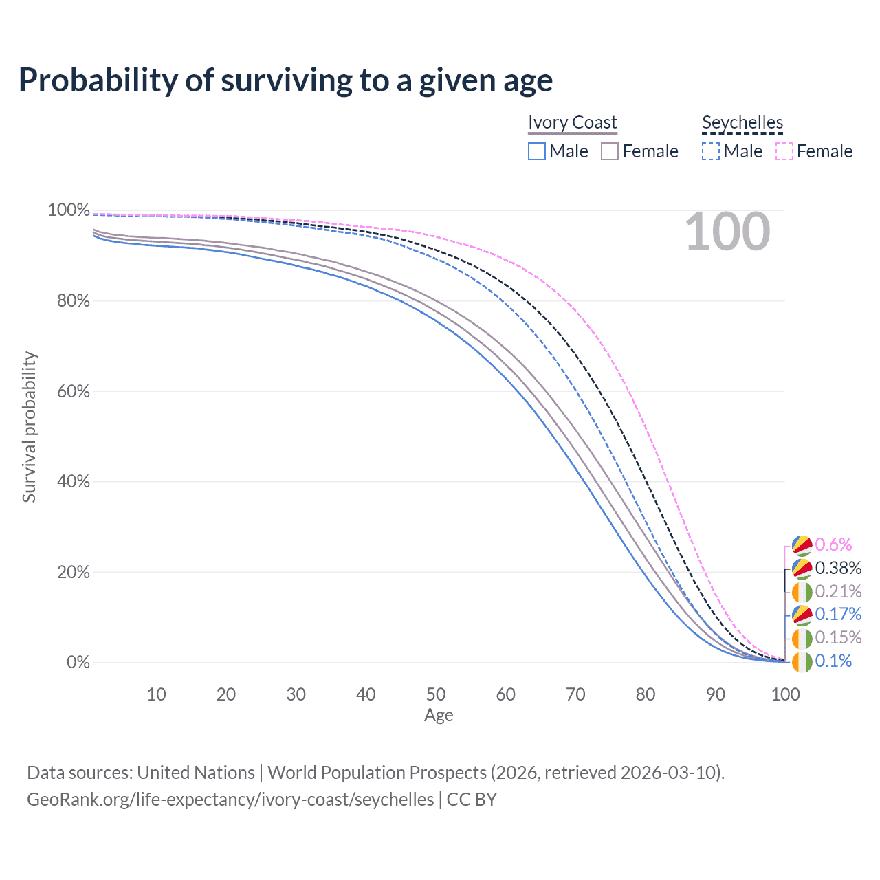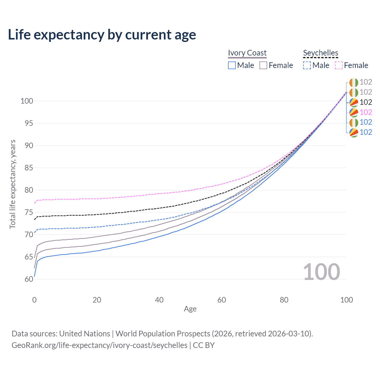 This life expectancy calculator shows the odds of living to 100, 95, 90, and below based on current age for both males and females in Ivory Coast and the Seychelles, along with mean and median age of death. The calculations are based on the 2026 life tables (actuarial tables) from the UN World Population Prospects.