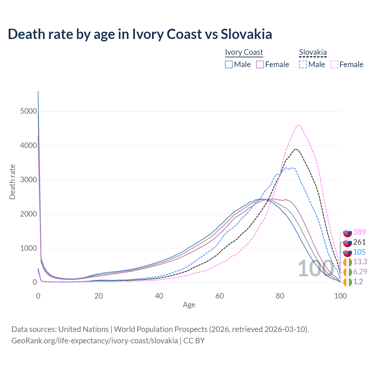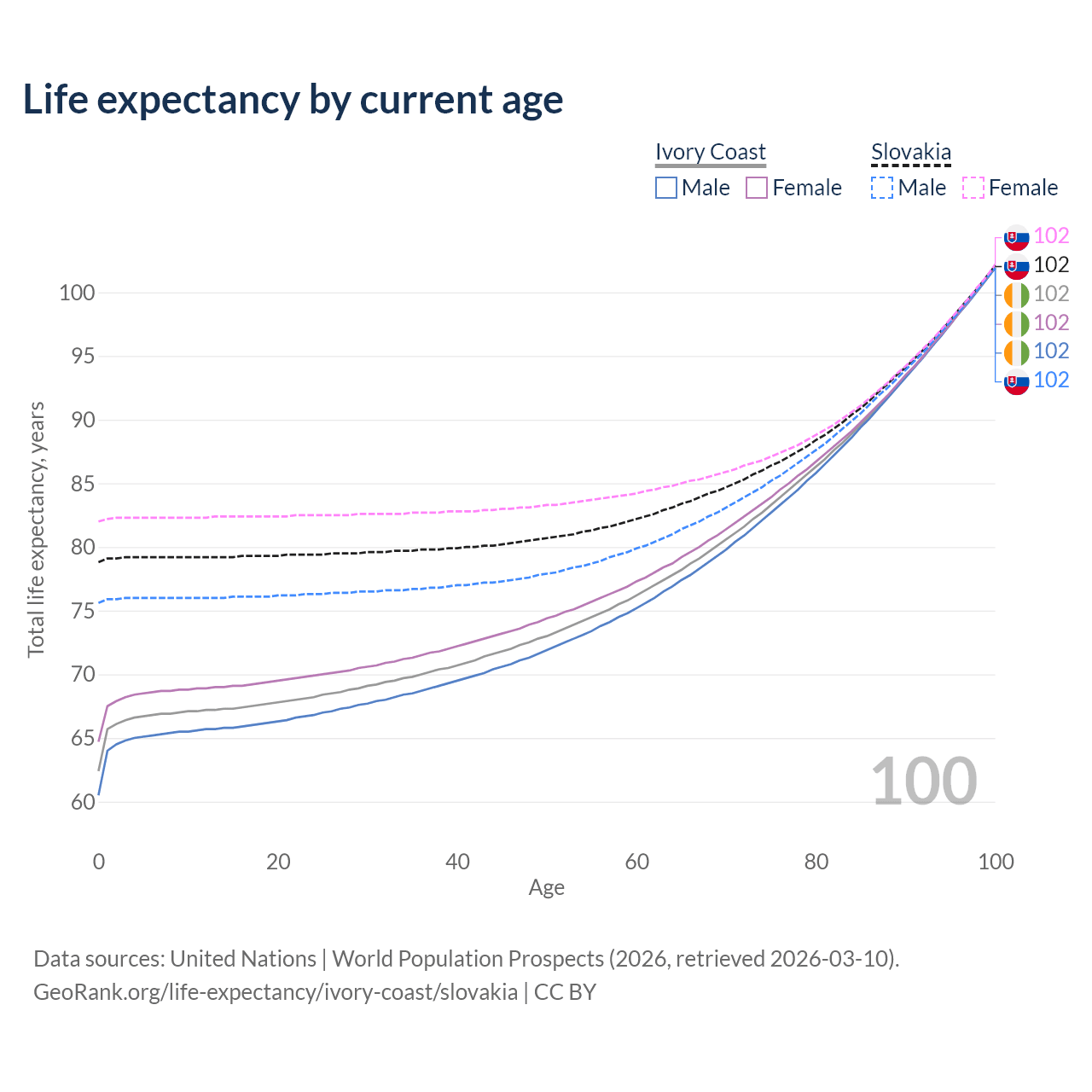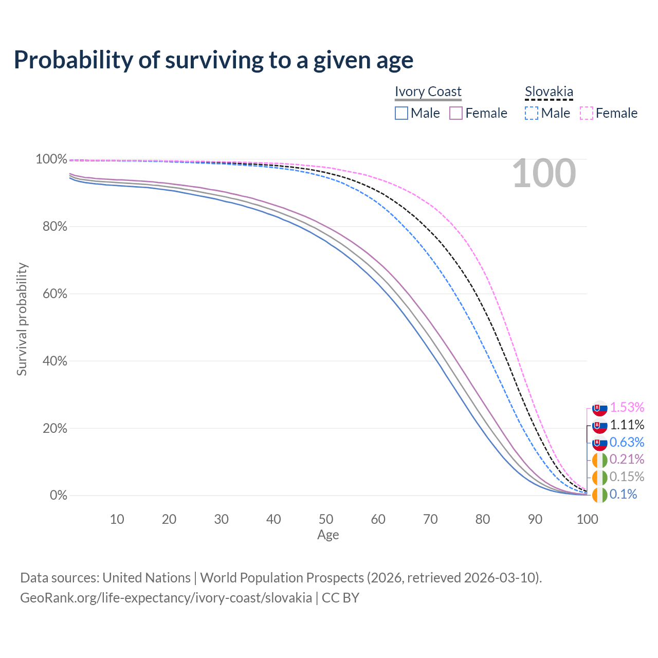 This life expectancy calculator shows the odds of living to 100, 95, 90, and below based on current age for both males and females in Ivory Coast and Slovakia, along with mean and median age of death. The calculations are based on the 2026 life tables (actuarial tables) from the UN World Population Prospects.
