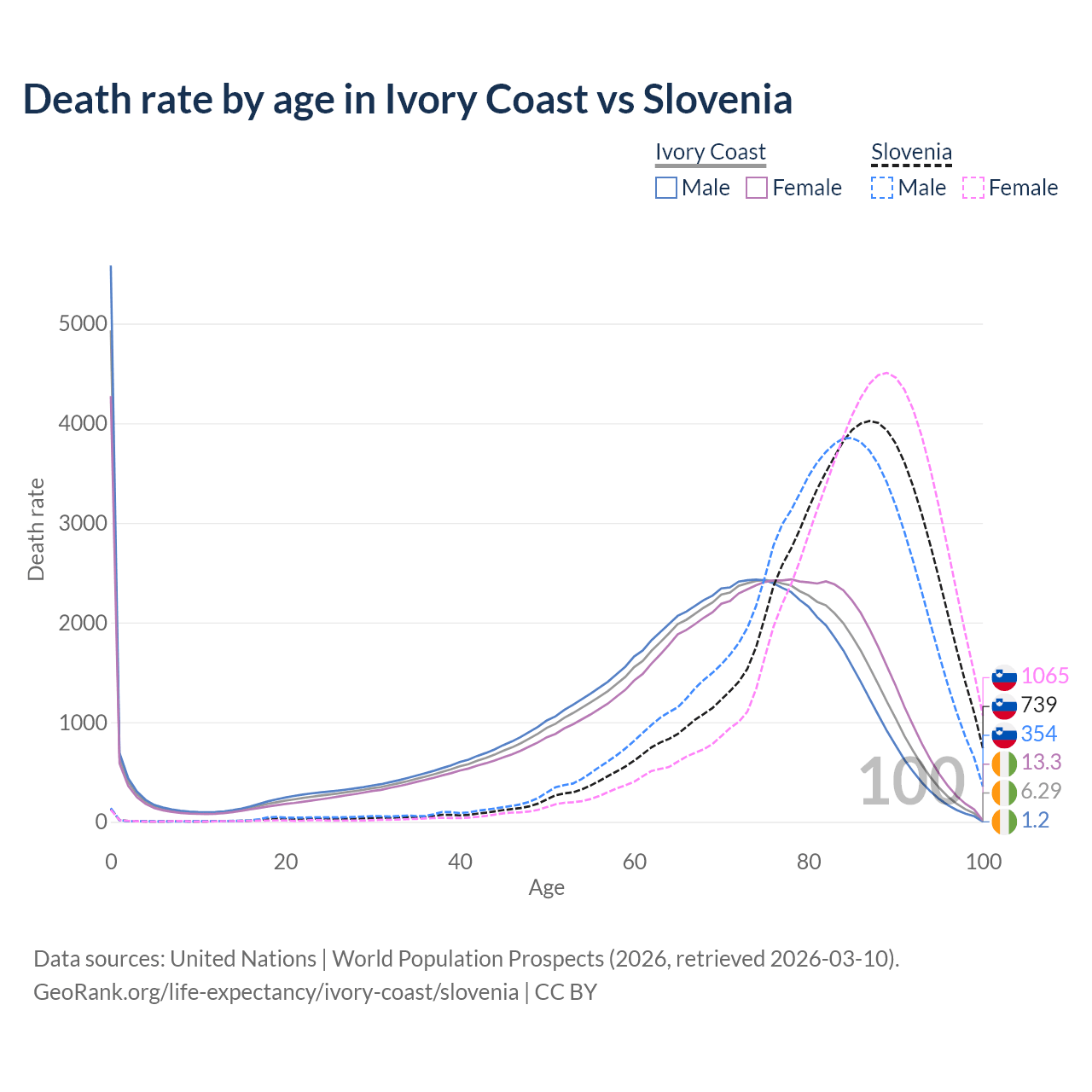 In Ivory Coast, the most common age of death is 0, compared to 87 in Slovenia. The median age of death is 68.6 in Ivory Coast and 84.4 in Slovenia, meaning only half of each cohort is expected to live past that age.