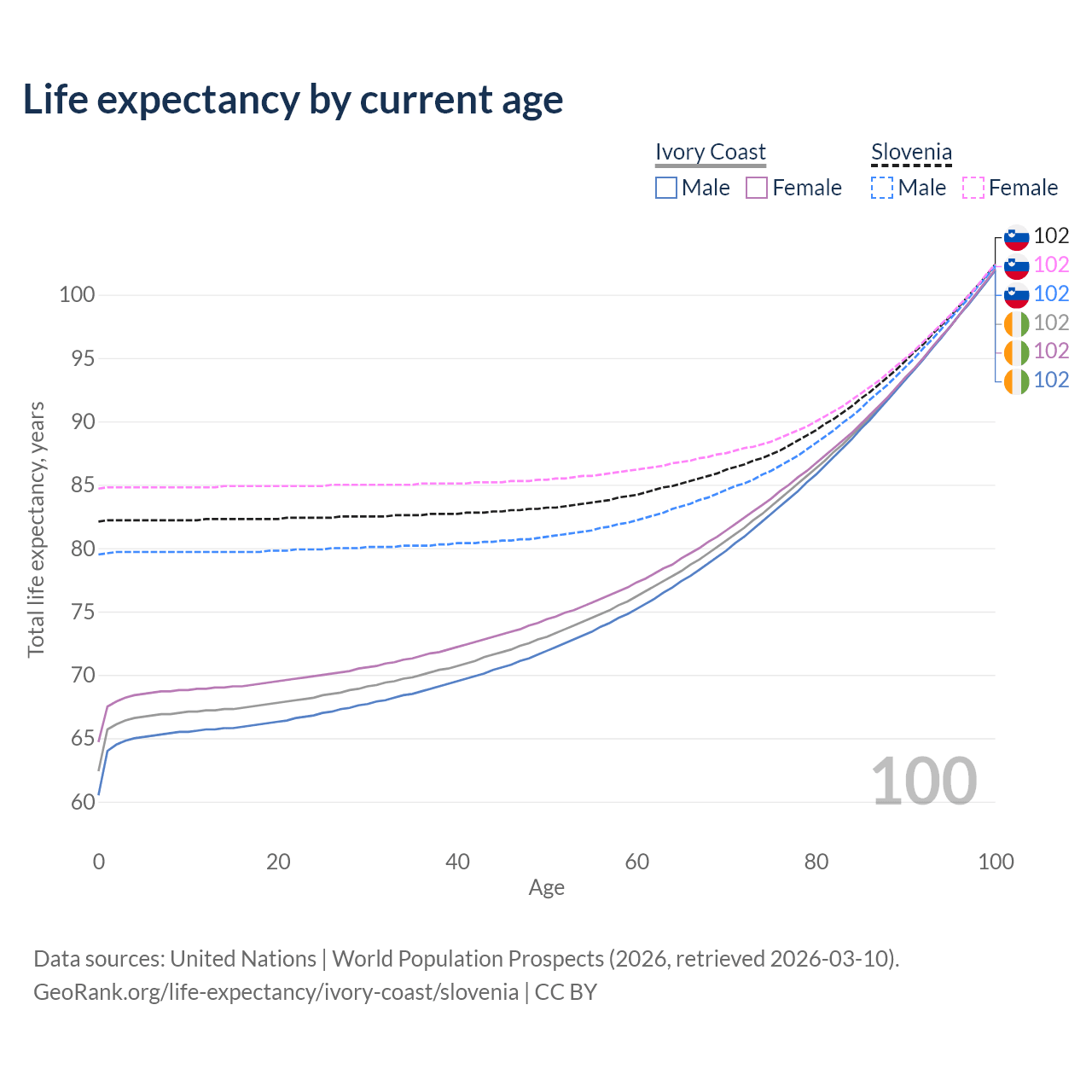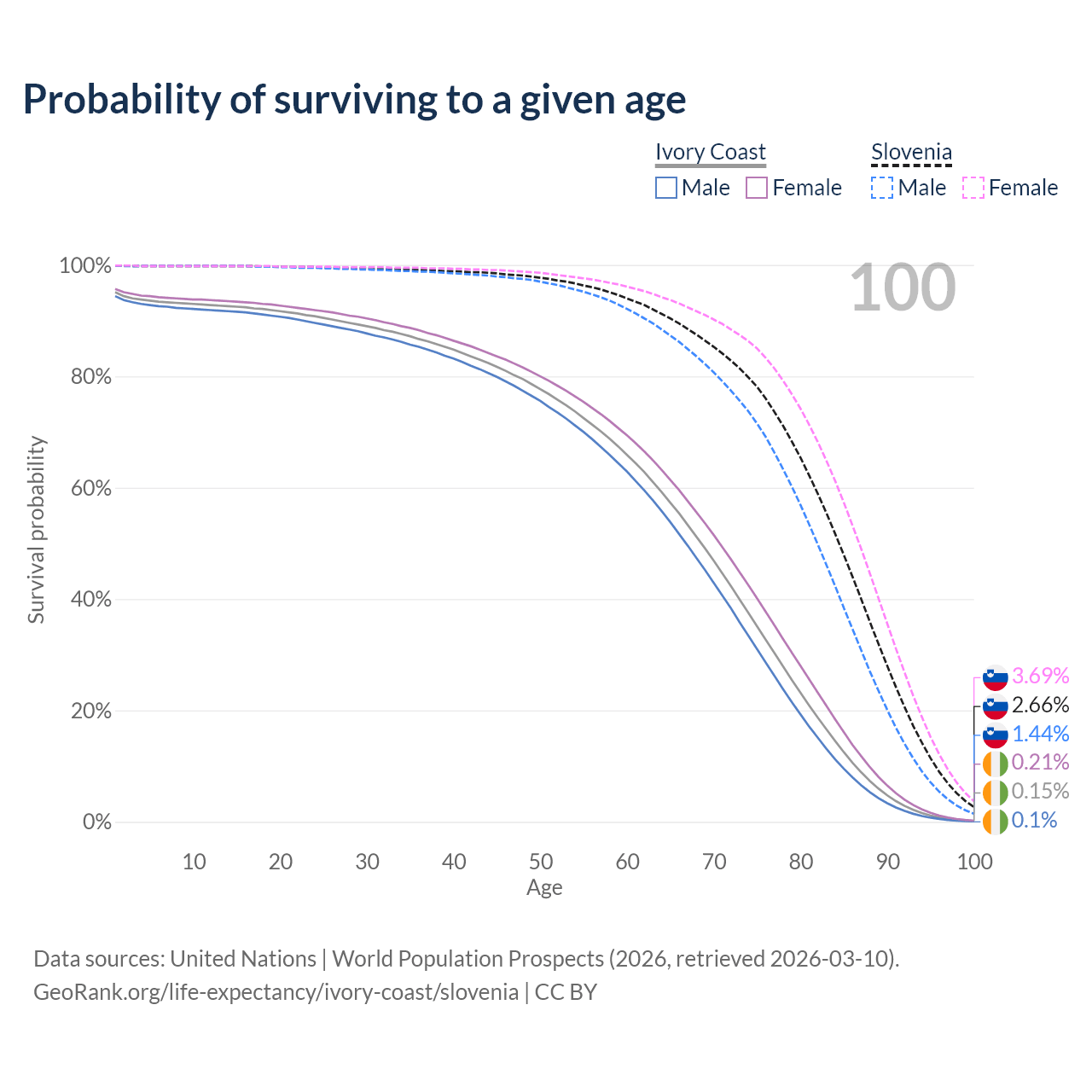 This life expectancy calculator shows the odds of living to 100, 95, 90, and below based on current age for both males and females in Ivory Coast and Slovenia, along with mean and median age of death. The calculations are based on the 2026 life tables (actuarial tables) from the UN World Population Prospects.