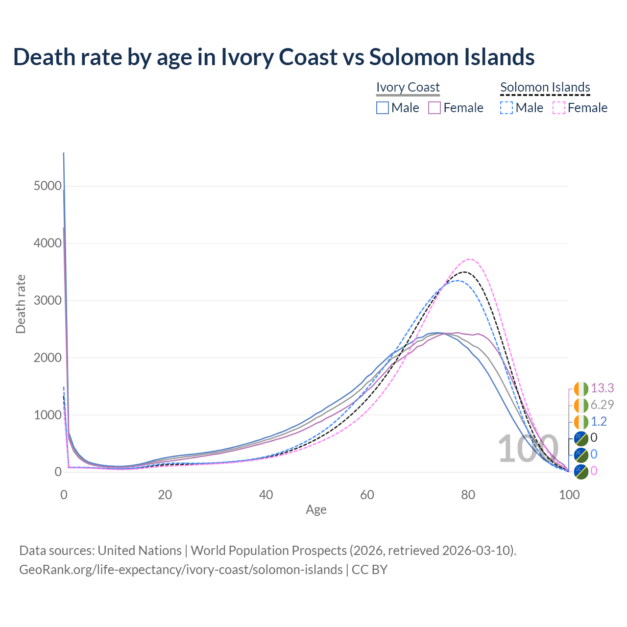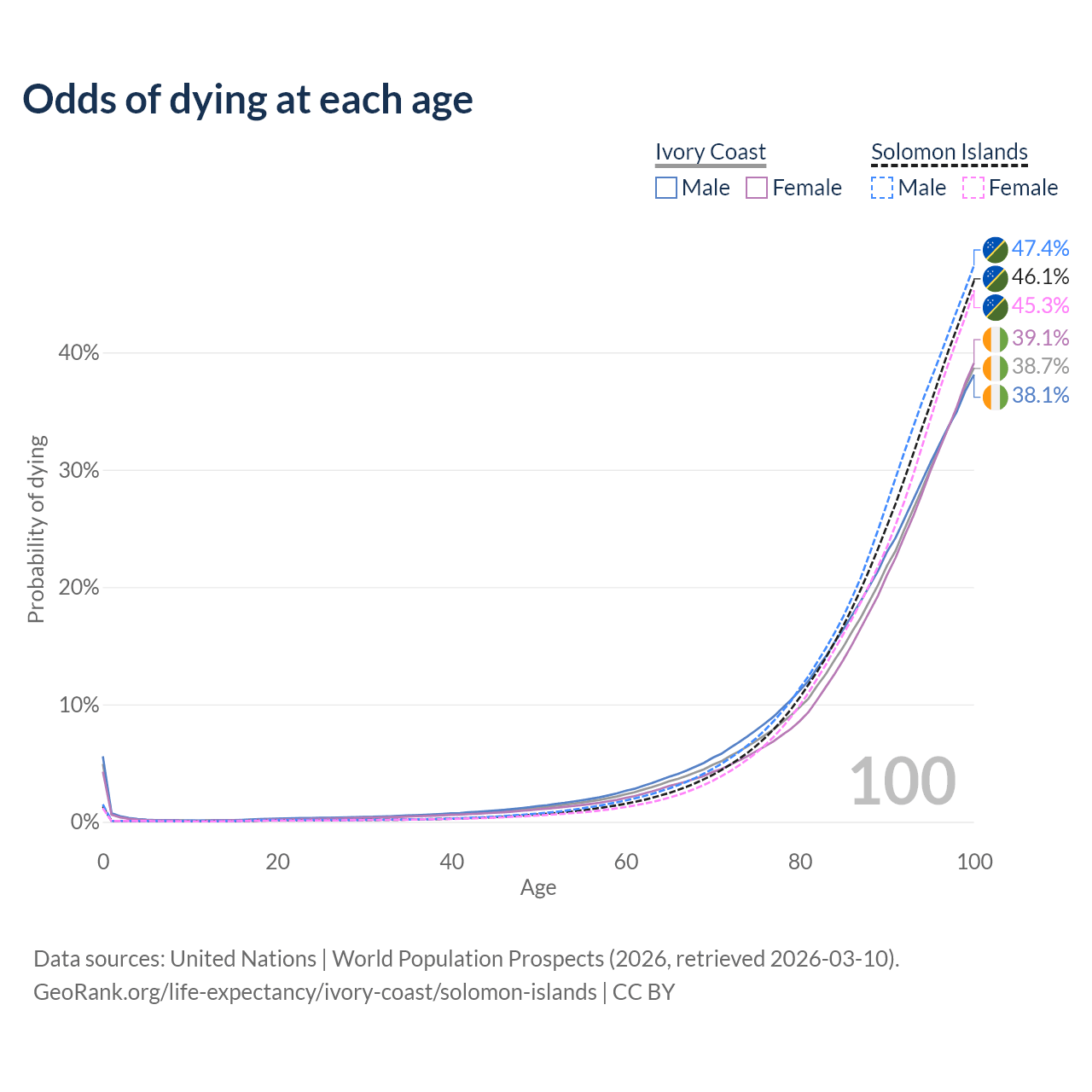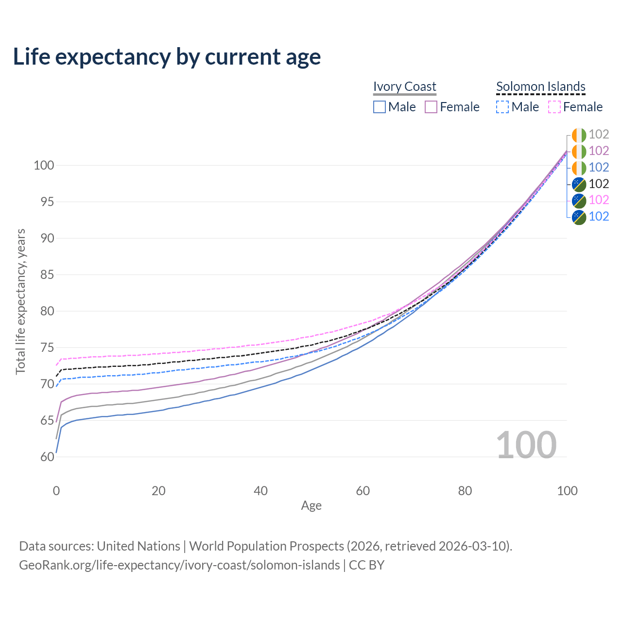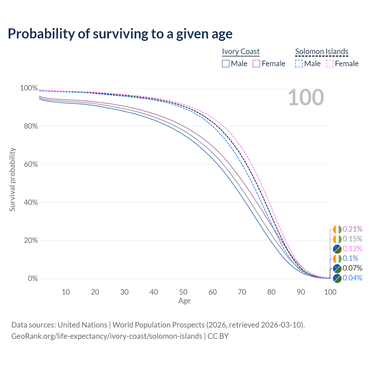 This life expectancy calculator shows the odds of living to 100, 95, 90, and below based on current age for both males and females in Ivory Coast and the Solomon Islands, along with mean and median age of death. The calculations are based on the 2026 life tables (actuarial tables) from the UN World Population Prospects.