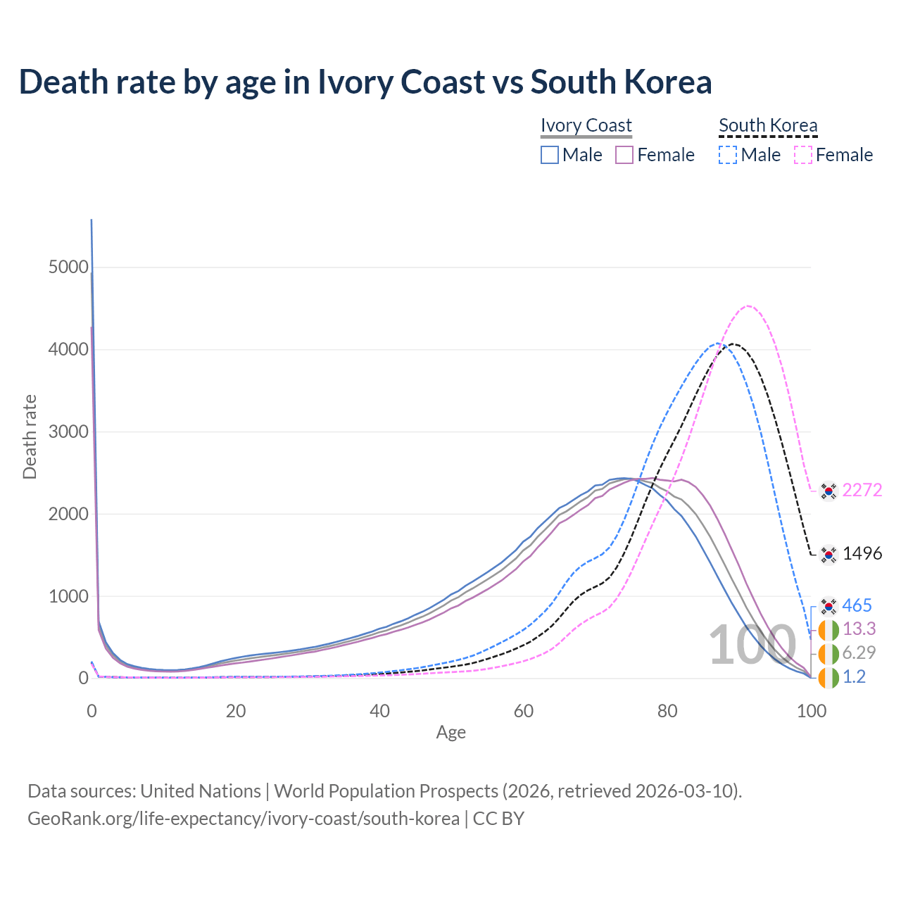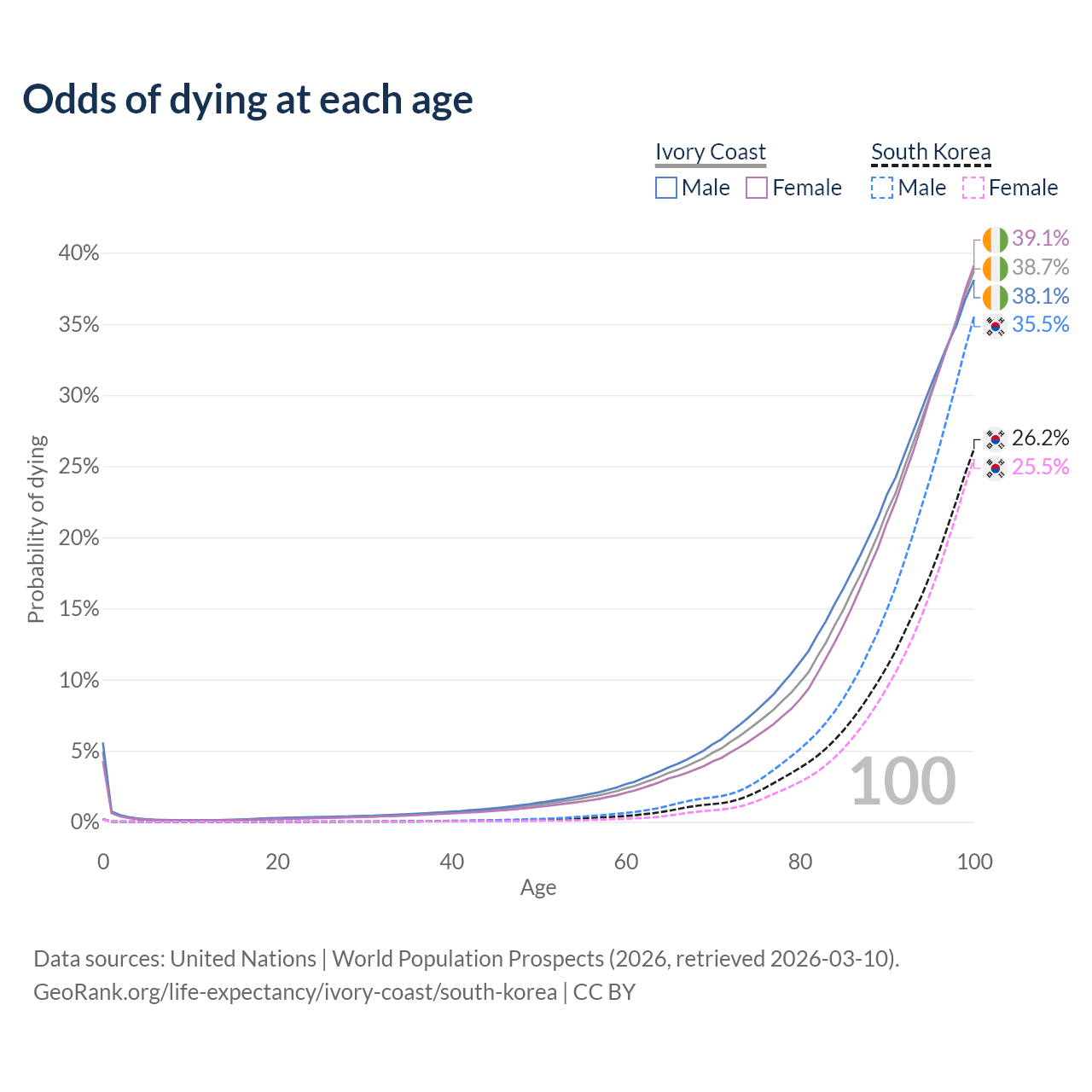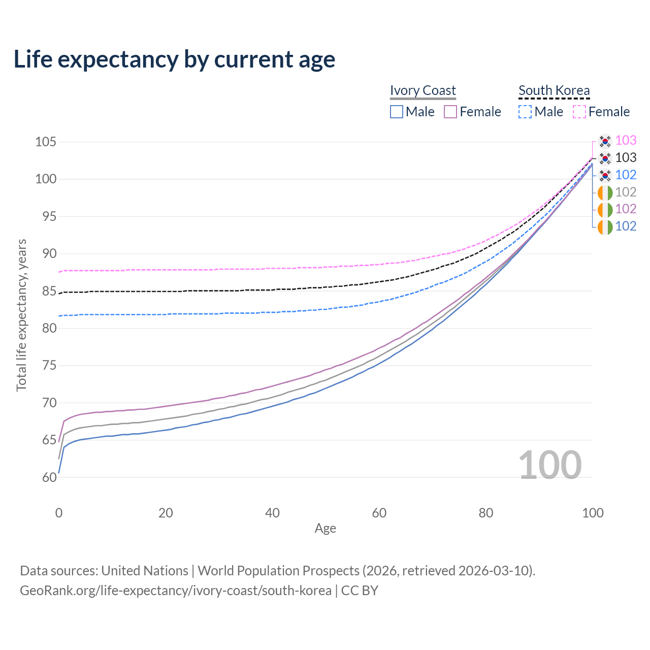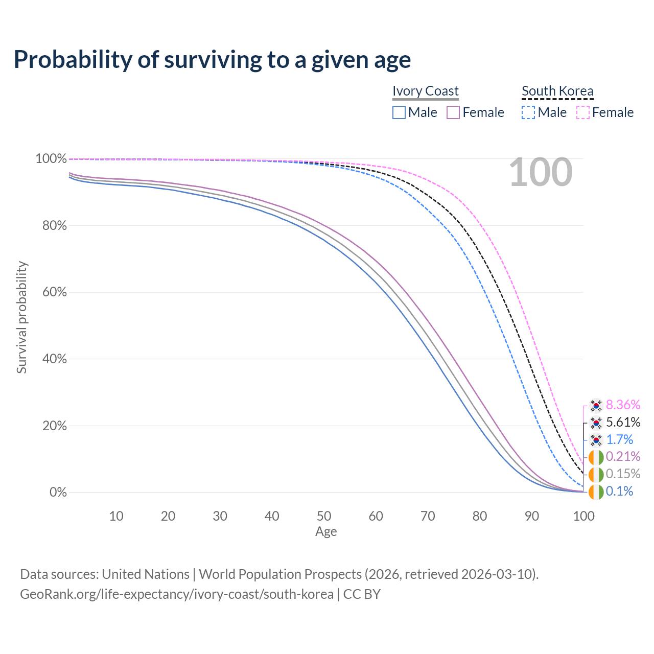 This life expectancy calculator shows the odds of living to 100, 95, 90, and below based on current age for both males and females in Ivory Coast and South Korea, along with mean and median age of death. The calculations are based on the 2026 life tables (actuarial tables) from the UN World Population Prospects.