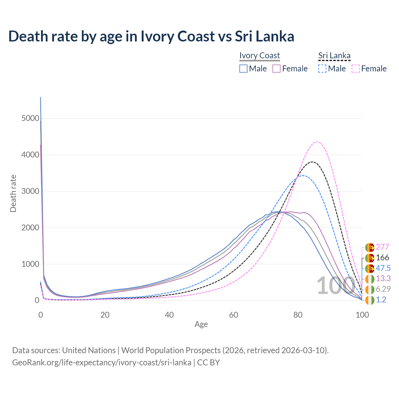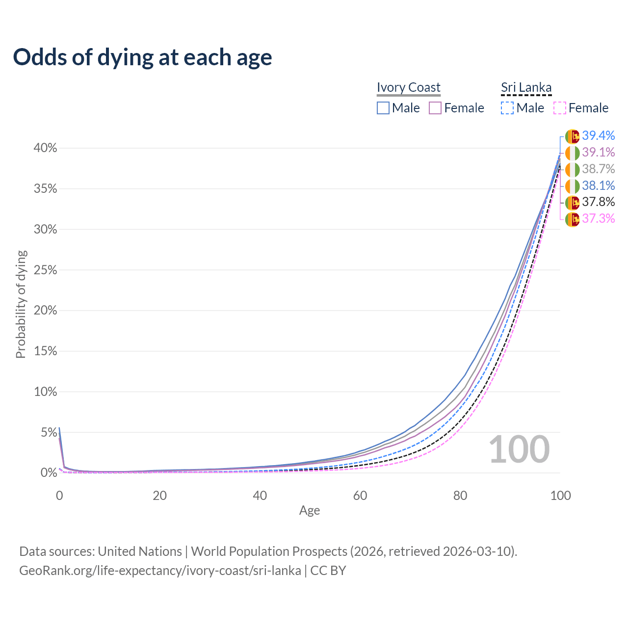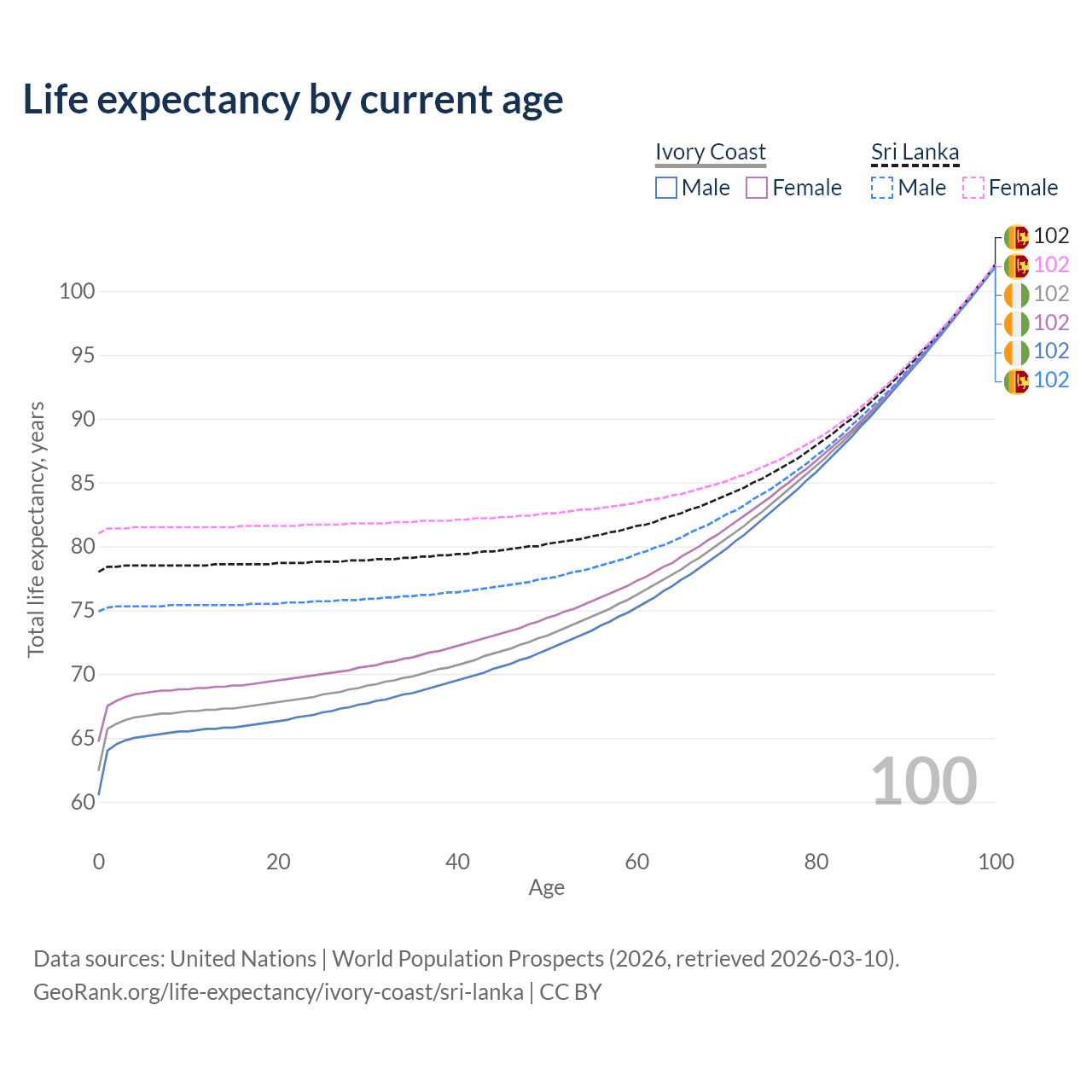 This life expectancy calculator shows the odds of living to 100, 95, 90, and below based on current age for both males and females in Ivory Coast and Sri Lanka, along with mean and median age of death. The calculations are based on the 2026 life tables (actuarial tables) from the UN World Population Prospects.
