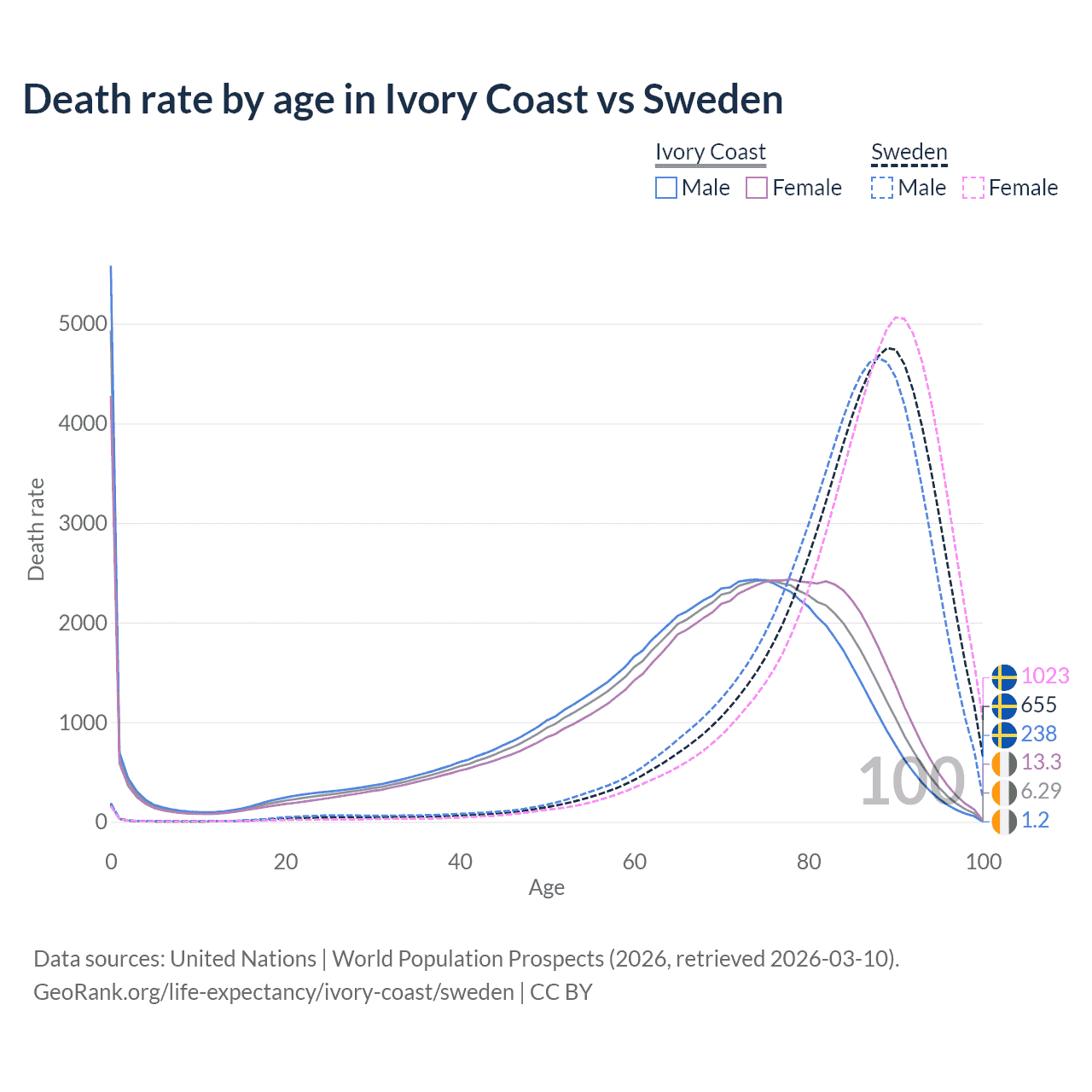 In Ivory Coast, the most common age of death is 0, compared to 89 in Sweden. The median age of death is 68.6 in Ivory Coast and 86.5 in Sweden, meaning only half of each cohort is expected to live past that age.