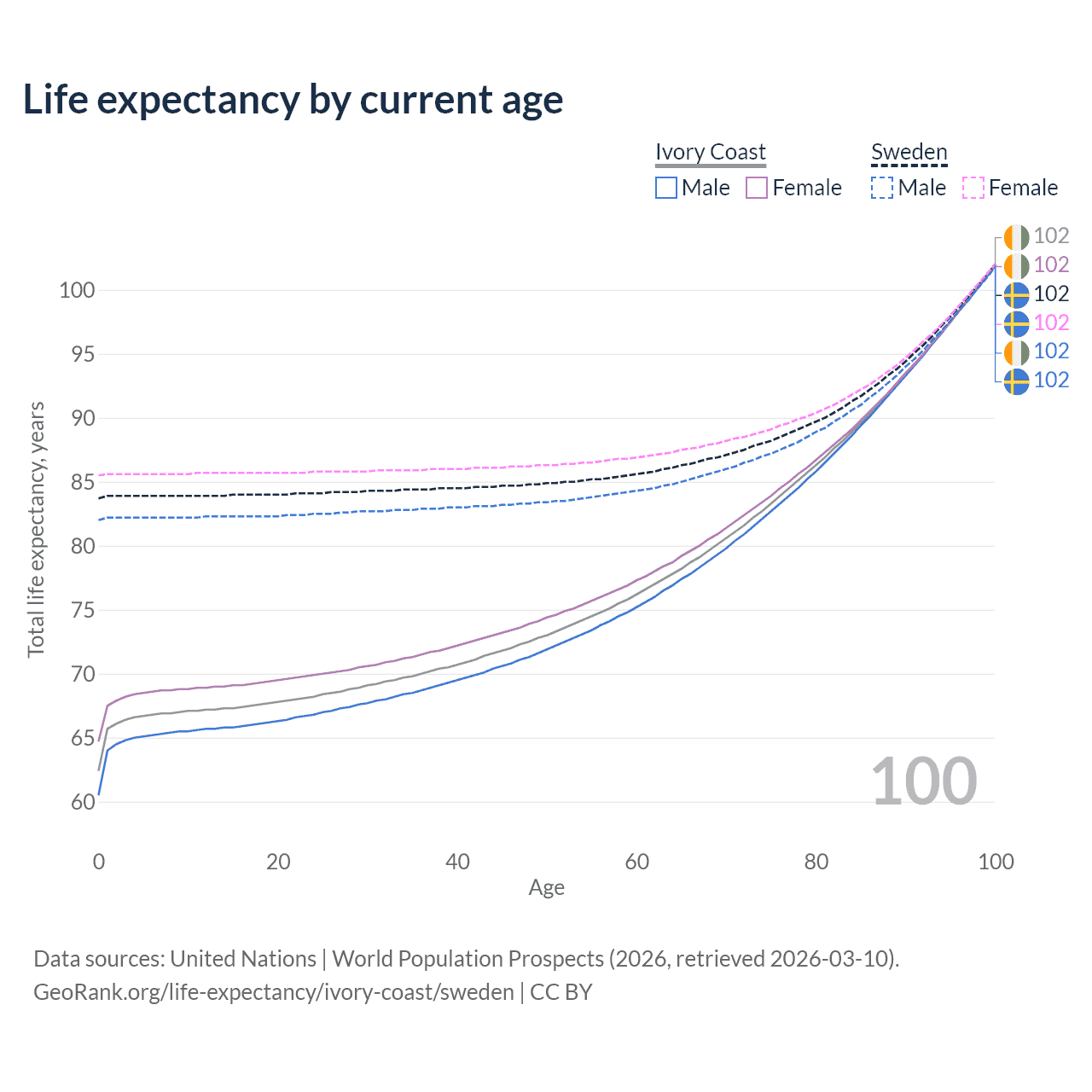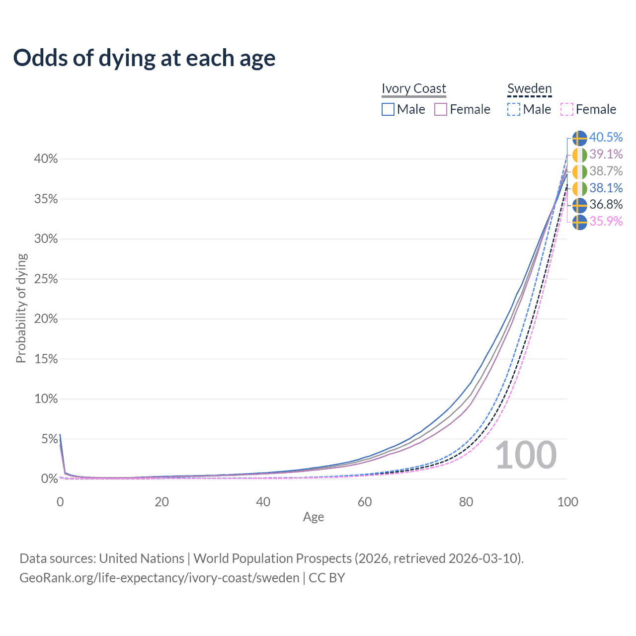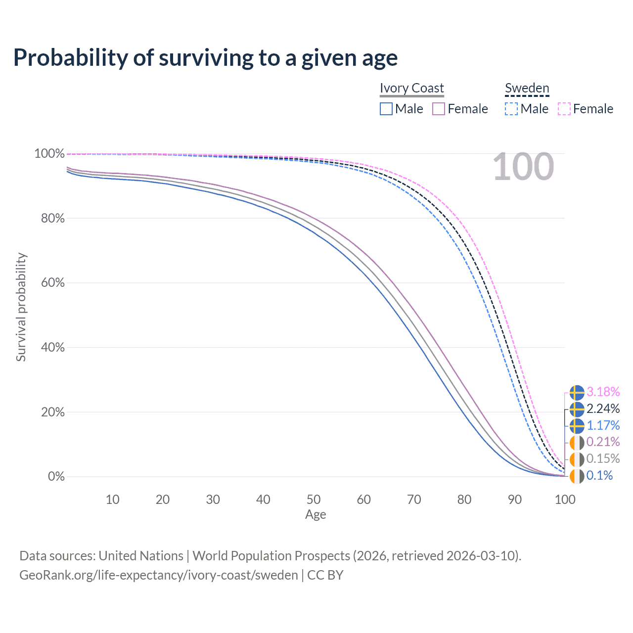 This life expectancy calculator shows the odds of living to 100, 95, 90, and below based on current age for both males and females in Ivory Coast and Sweden, along with mean and median age of death. The calculations are based on the 2026 life tables (actuarial tables) from the UN World Population Prospects.
