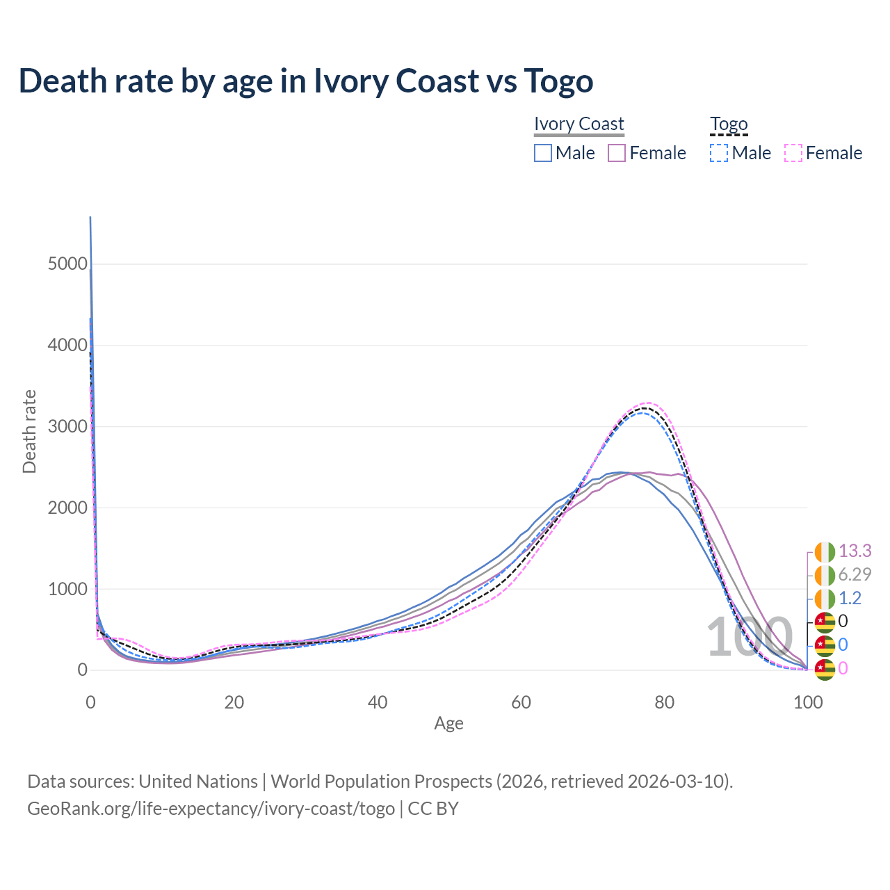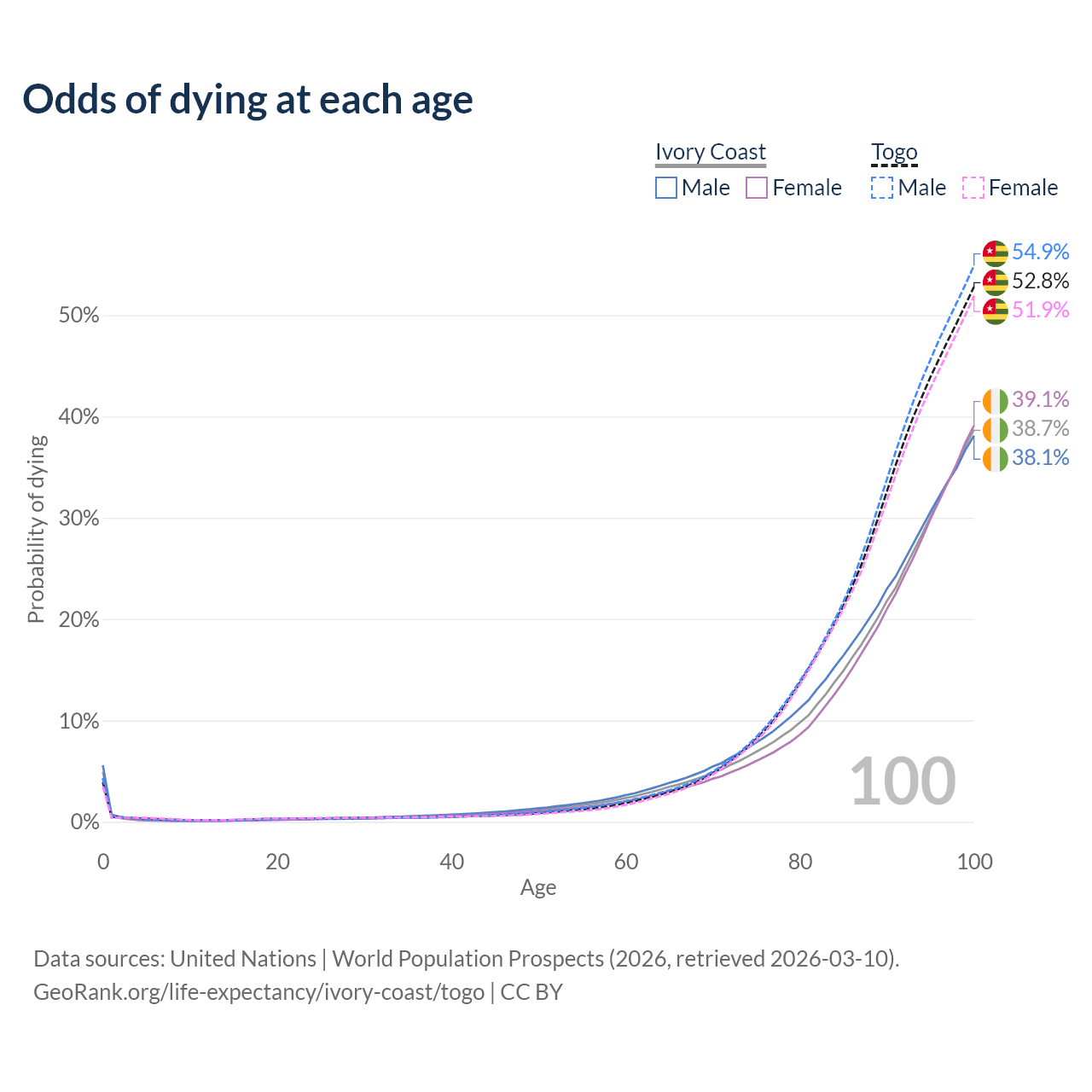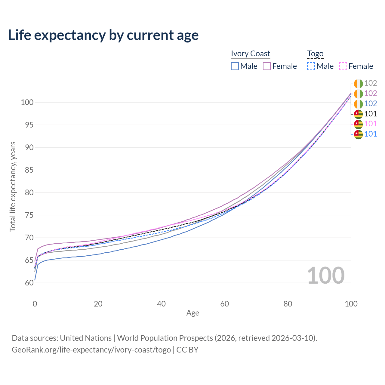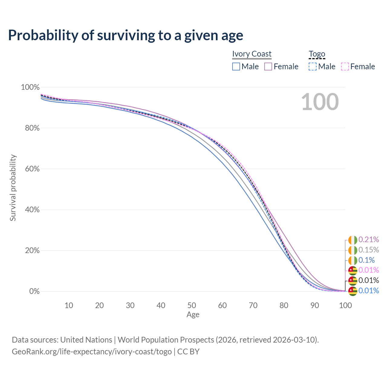 This life expectancy calculator shows the odds of living to 100, 95, 90, and below based on current age for both males and females in Ivory Coast and Togo, along with mean and median age of death. The calculations are based on the 2026 life tables (actuarial tables) from the UN World Population Prospects.