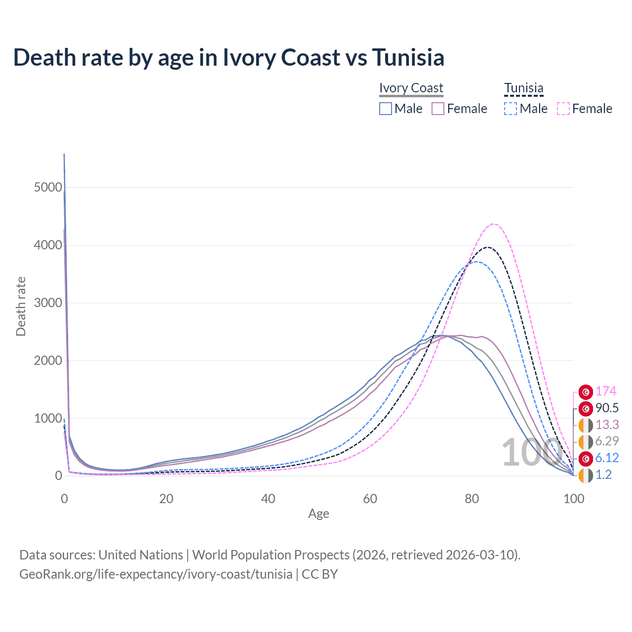 In Ivory Coast, the most common age of death is 0, compared to 83 in Tunisia. The median age of death is 68.6 in Ivory Coast and 80.2 in Tunisia, meaning only half of each cohort is expected to live past that age.