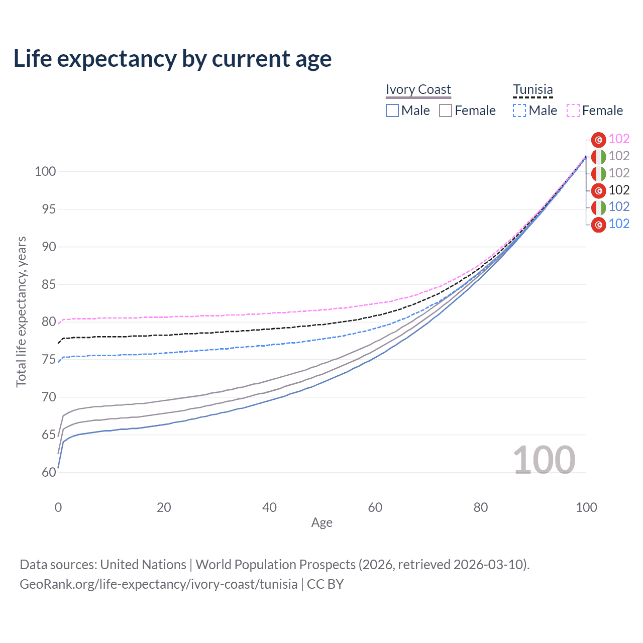 This life expectancy calculator shows the odds of living to 100, 95, 90, and below based on current age for both males and females in Ivory Coast and Tunisia, along with mean and median age of death. The calculations are based on the 2026 life tables (actuarial tables) from the UN World Population Prospects.