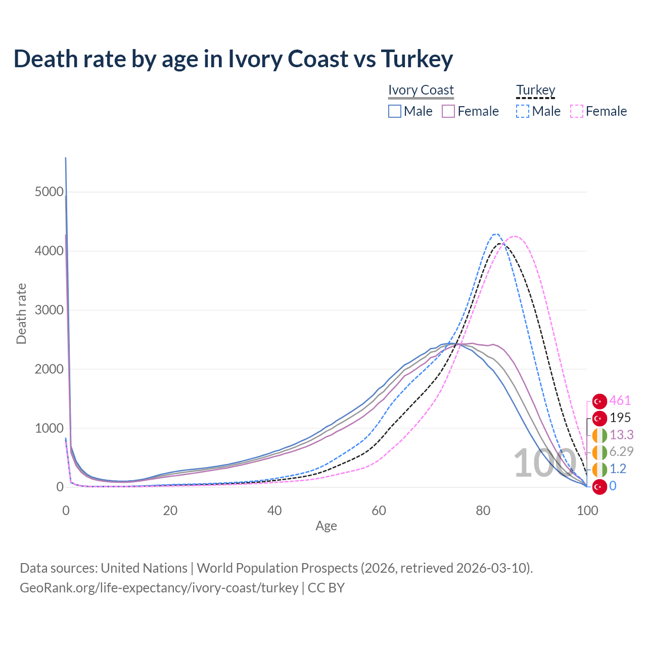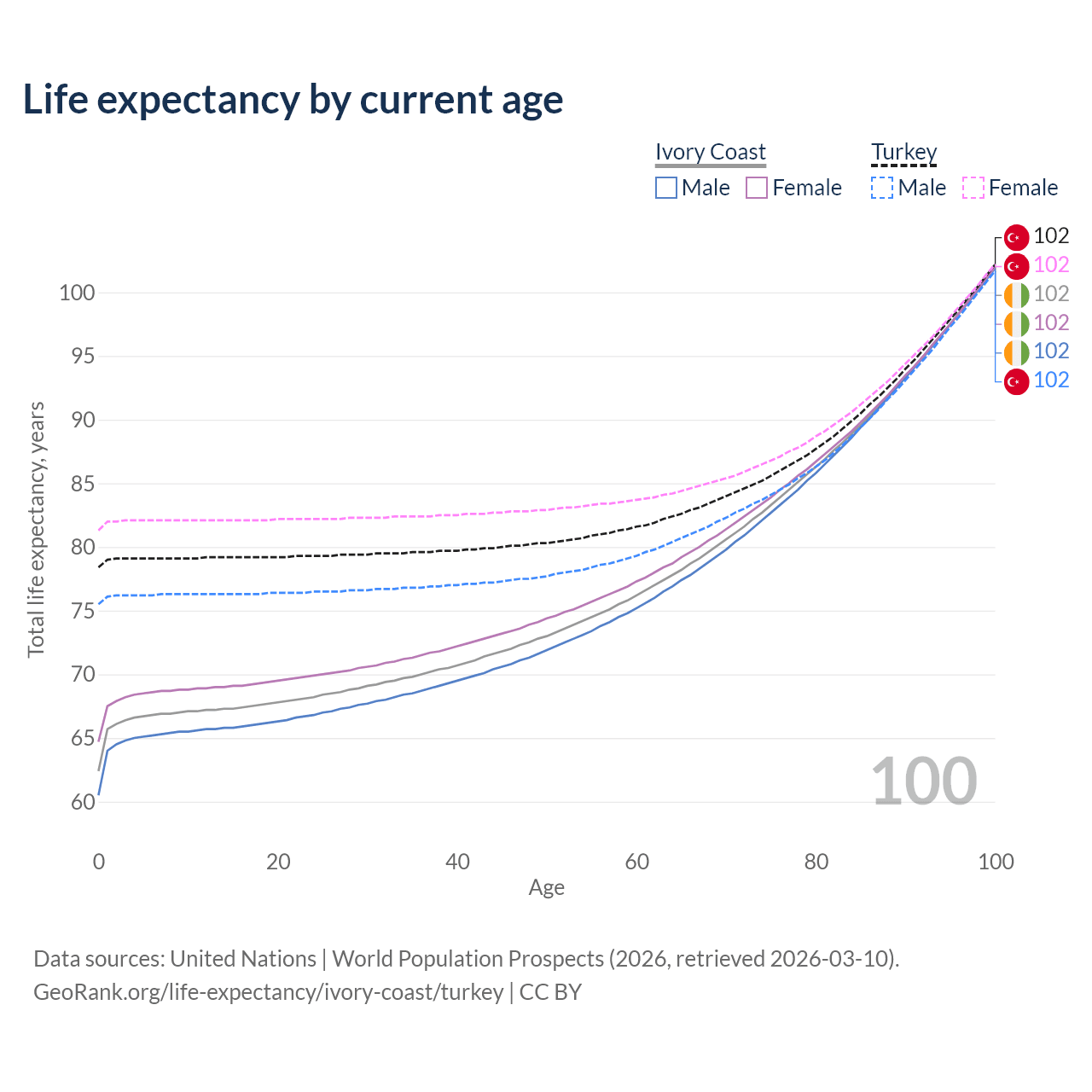 This life expectancy calculator shows the odds of living to 100, 95, 90, and below based on current age for both males and females in Ivory Coast and Turkey, along with mean and median age of death. The calculations are based on the 2026 life tables (actuarial tables) from the UN World Population Prospects.