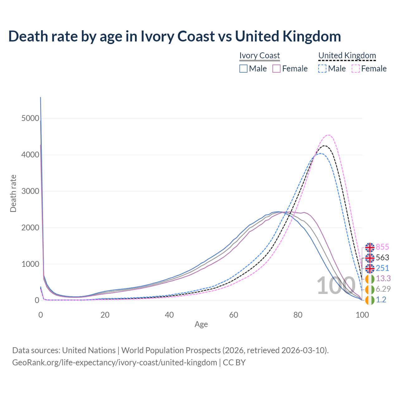 In Ivory Coast, the most common age of death is 0, compared to 88 in the United Kingdom. The median age of death is 68.6 in Ivory Coast and 84.9 in the United Kingdom, meaning only half of each cohort is expected to live past that age.