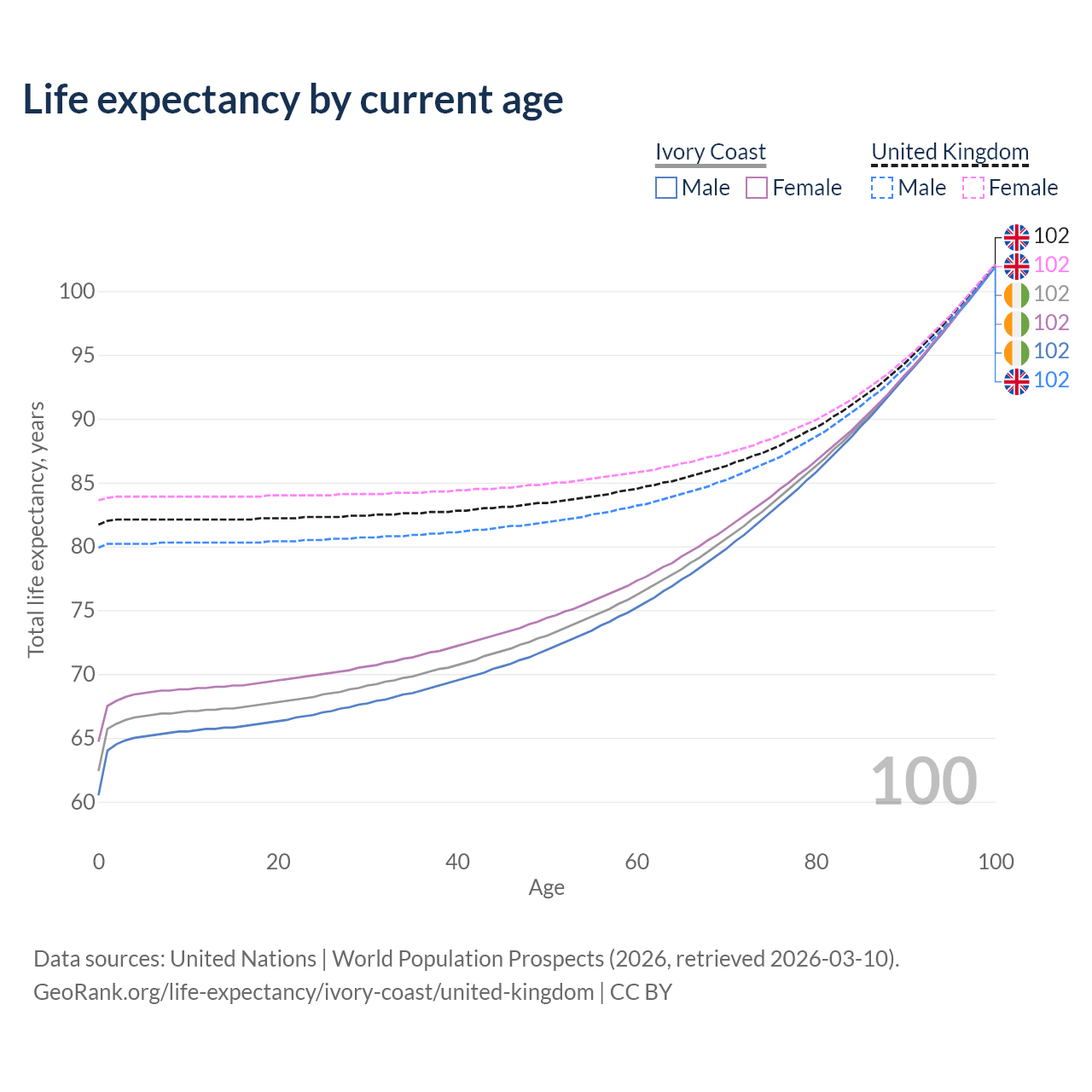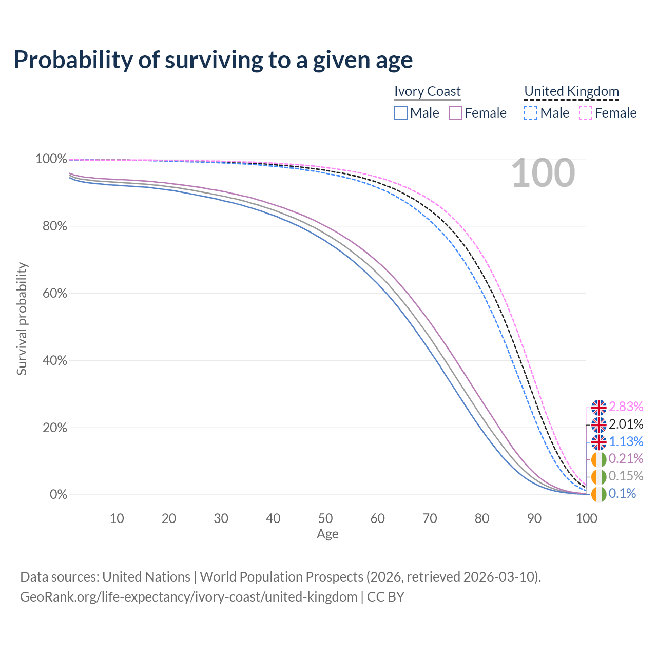 This life expectancy calculator shows the odds of living to 100, 95, 90, and below based on current age for both males and females in Ivory Coast and the United Kingdom, along with mean and median age of death. The calculations are based on the 2026 life tables (actuarial tables) from the UN World Population Prospects.