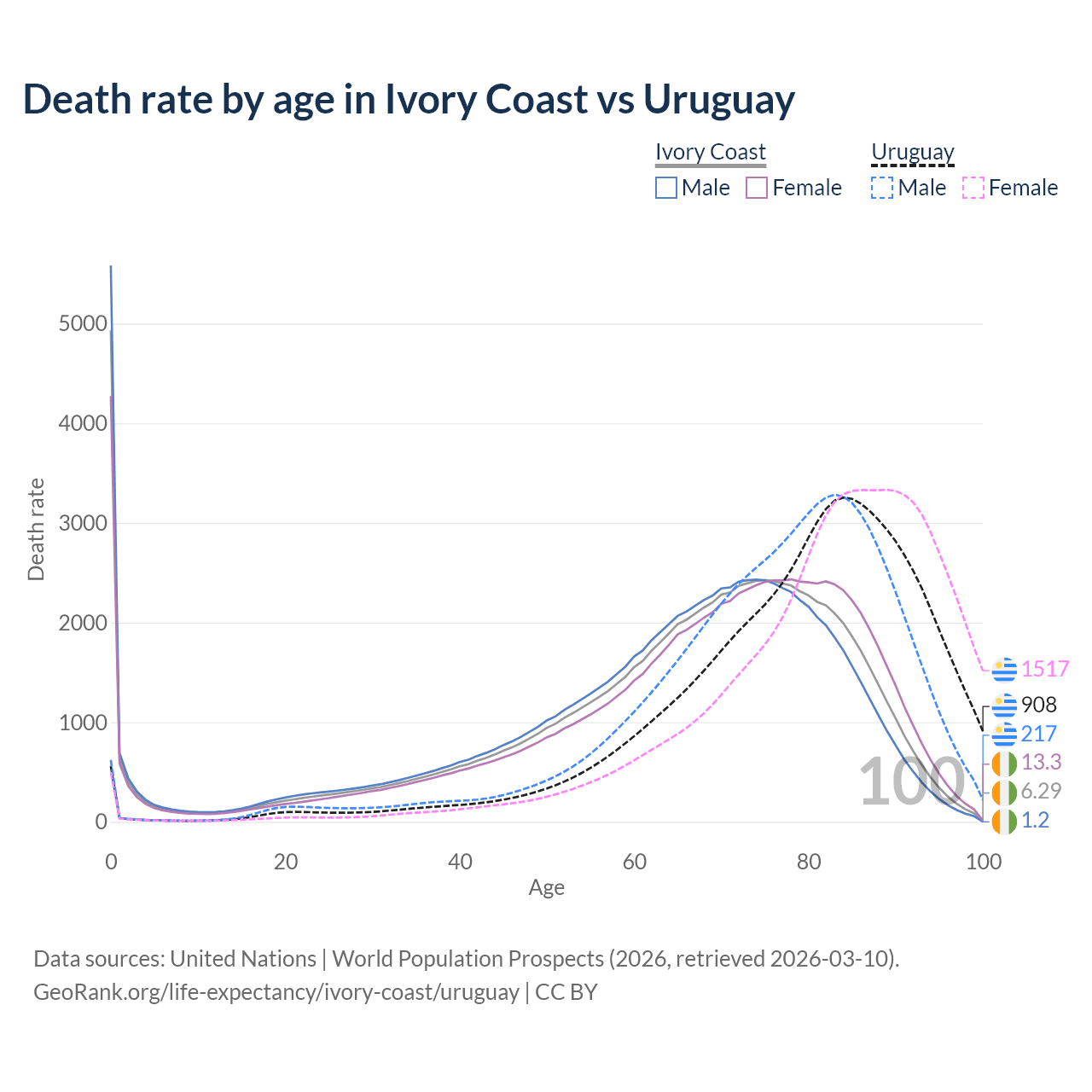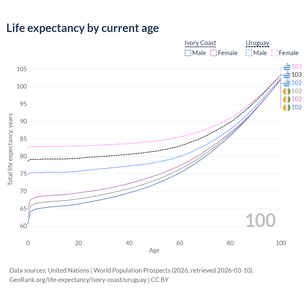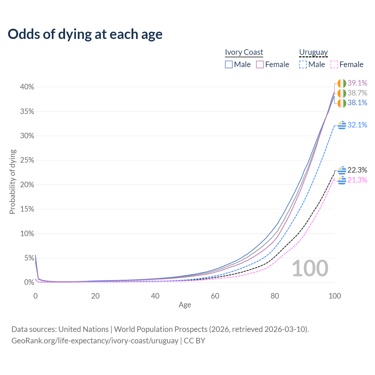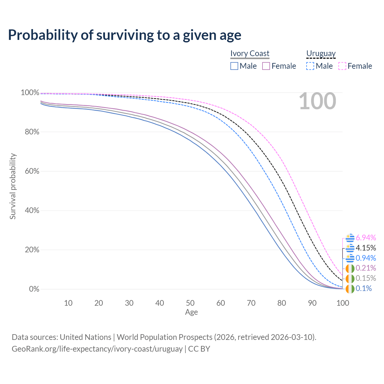 This life expectancy calculator shows the odds of living to 100, 95, 90, and below based on current age for both males and females in Ivory Coast and Uruguay, along with mean and median age of death. The calculations are based on the 2026 life tables (actuarial tables) from the UN World Population Prospects.