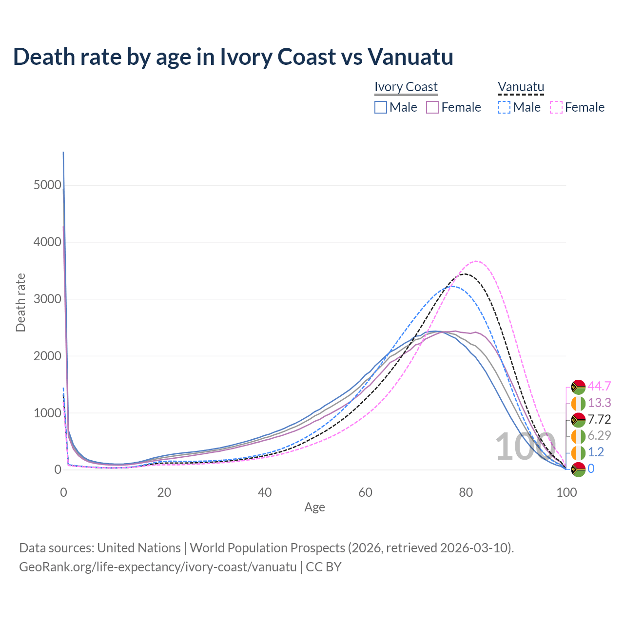 In Ivory Coast, the most common age of death is 0, compared to 80 in Vanuatu. The median age of death is 68.6 in Ivory Coast and 75.9 in Vanuatu, meaning only half of each cohort is expected to live past that age.