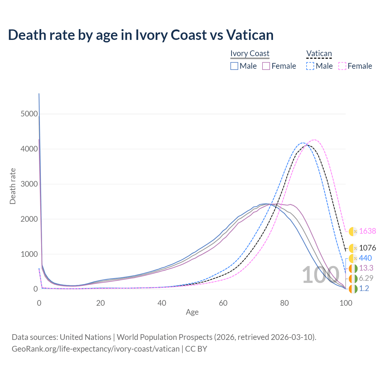 In Ivory Coast, the most common age of death is 0, compared to 88 in the Vatican. The median age of death is 68.6 in Ivory Coast and 85.7 in the Vatican, meaning only half of each cohort is expected to live past that age.
