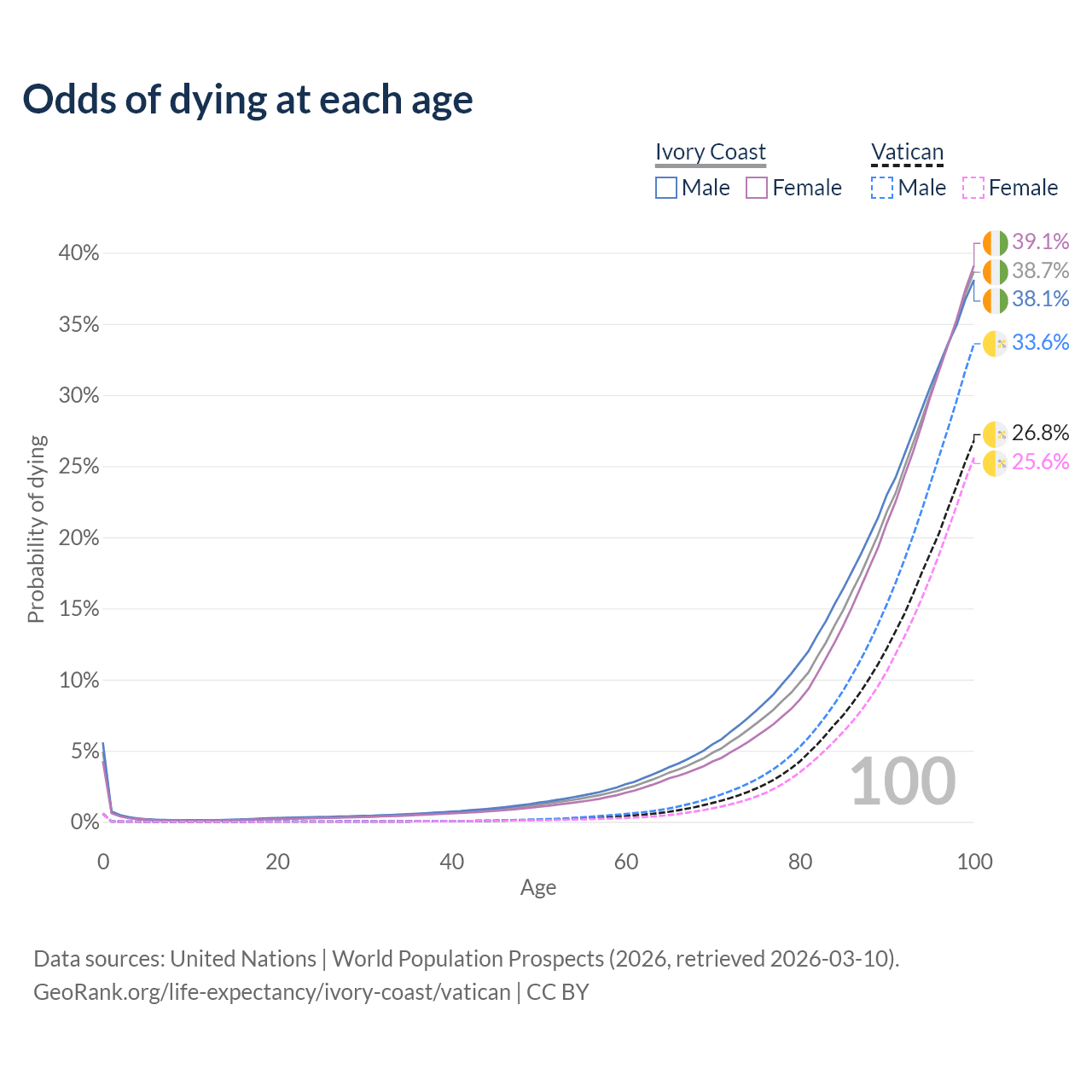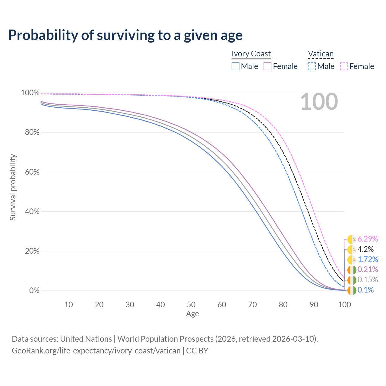 This life expectancy calculator shows the odds of living to 100, 95, 90, and below based on current age for both males and females in Ivory Coast and the Vatican, along with mean and median age of death. The calculations are based on the 2026 life tables (actuarial tables) from the UN World Population Prospects.
