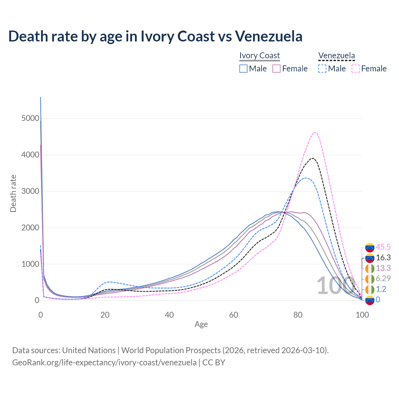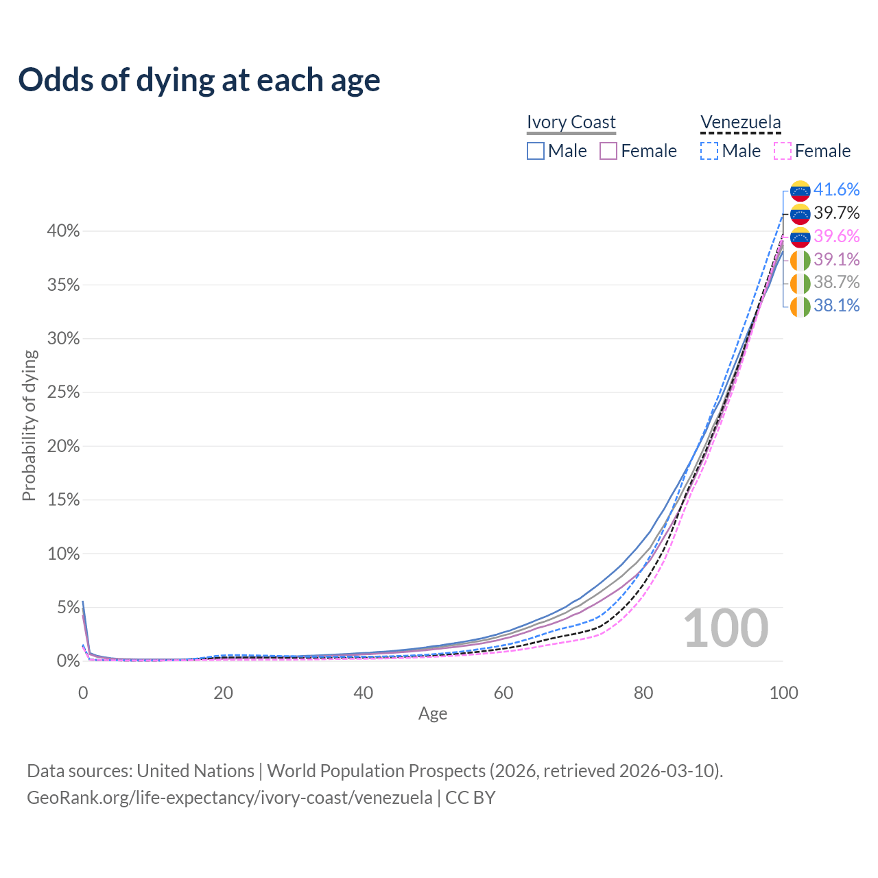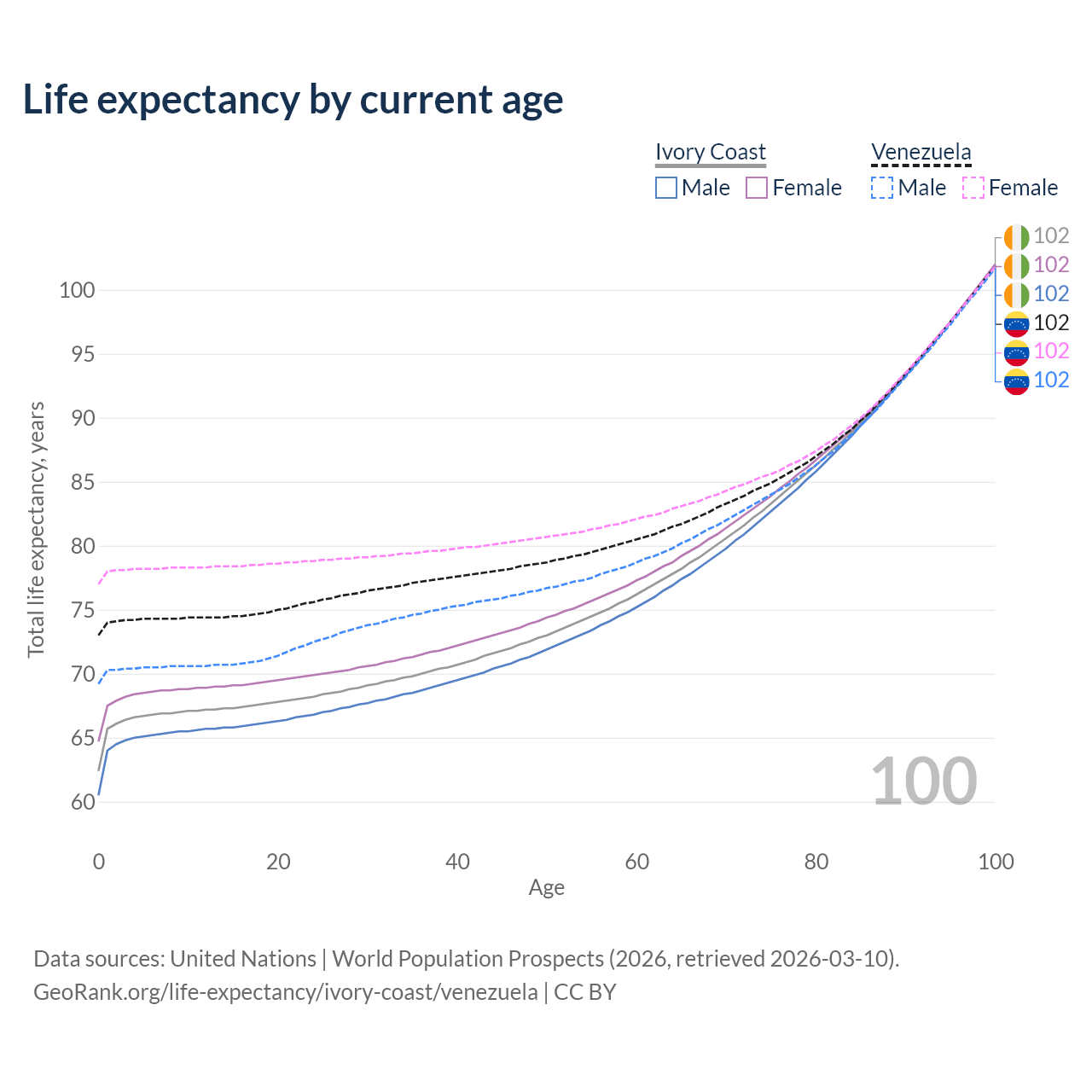 This life expectancy calculator shows the odds of living to 100, 95, 90, and below based on current age for both males and females in Ivory Coast and Venezuela, along with mean and median age of death. The calculations are based on the 2026 life tables (actuarial tables) from the UN World Population Prospects.