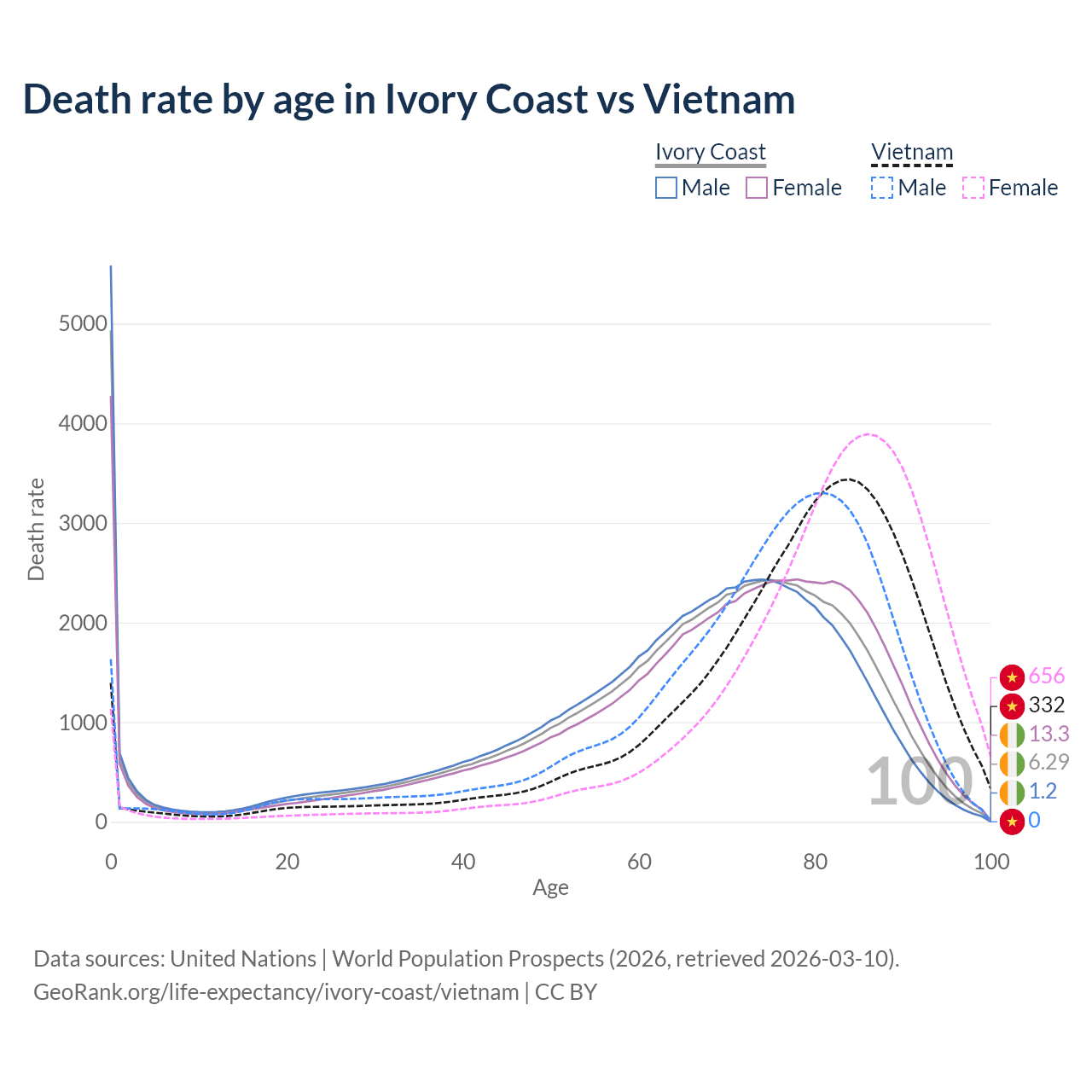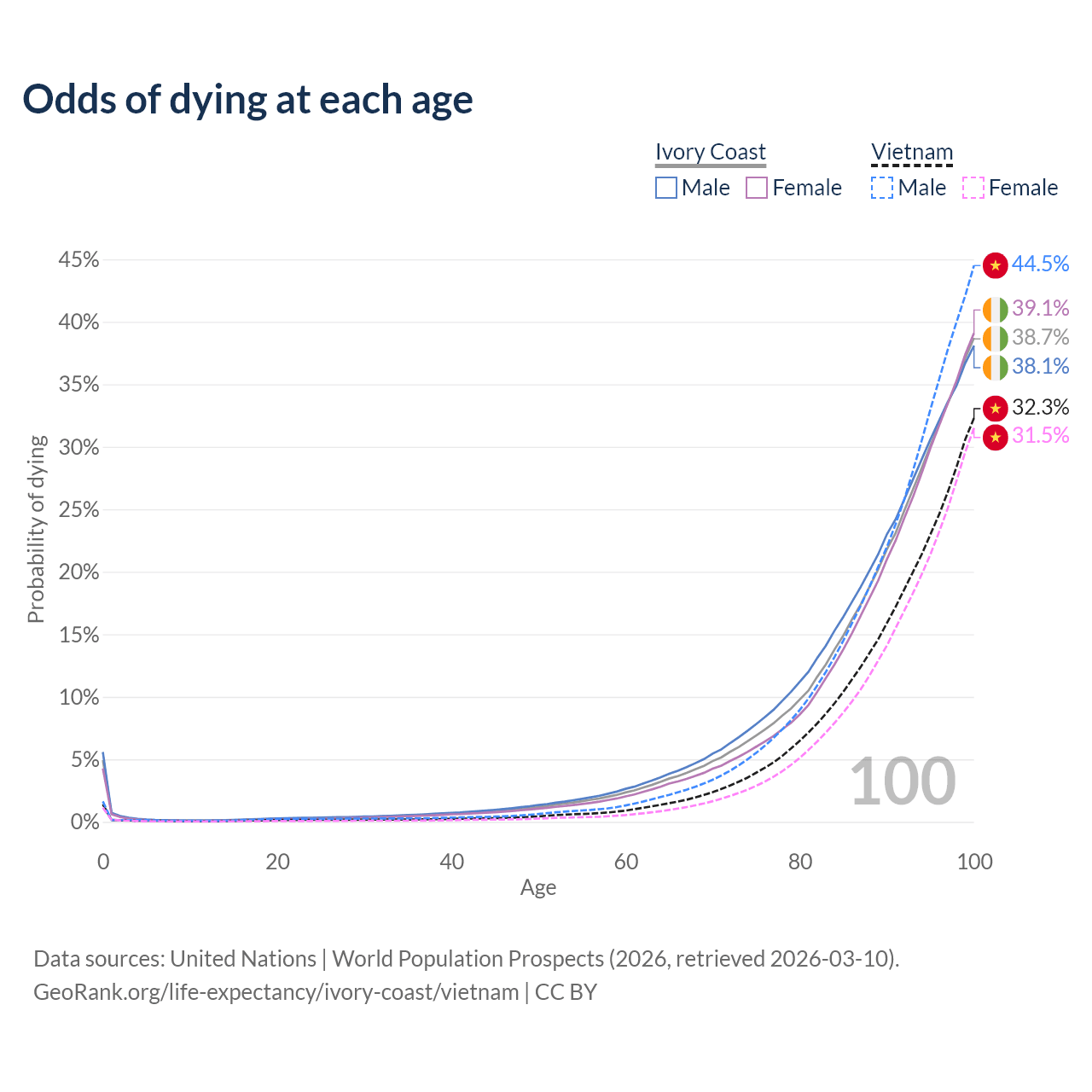This life expectancy calculator shows the odds of living to 100, 95, 90, and below based on current age for both males and females in Ivory Coast and Vietnam, along with mean and median age of death. The calculations are based on the 2026 life tables (actuarial tables) from the UN World Population Prospects.