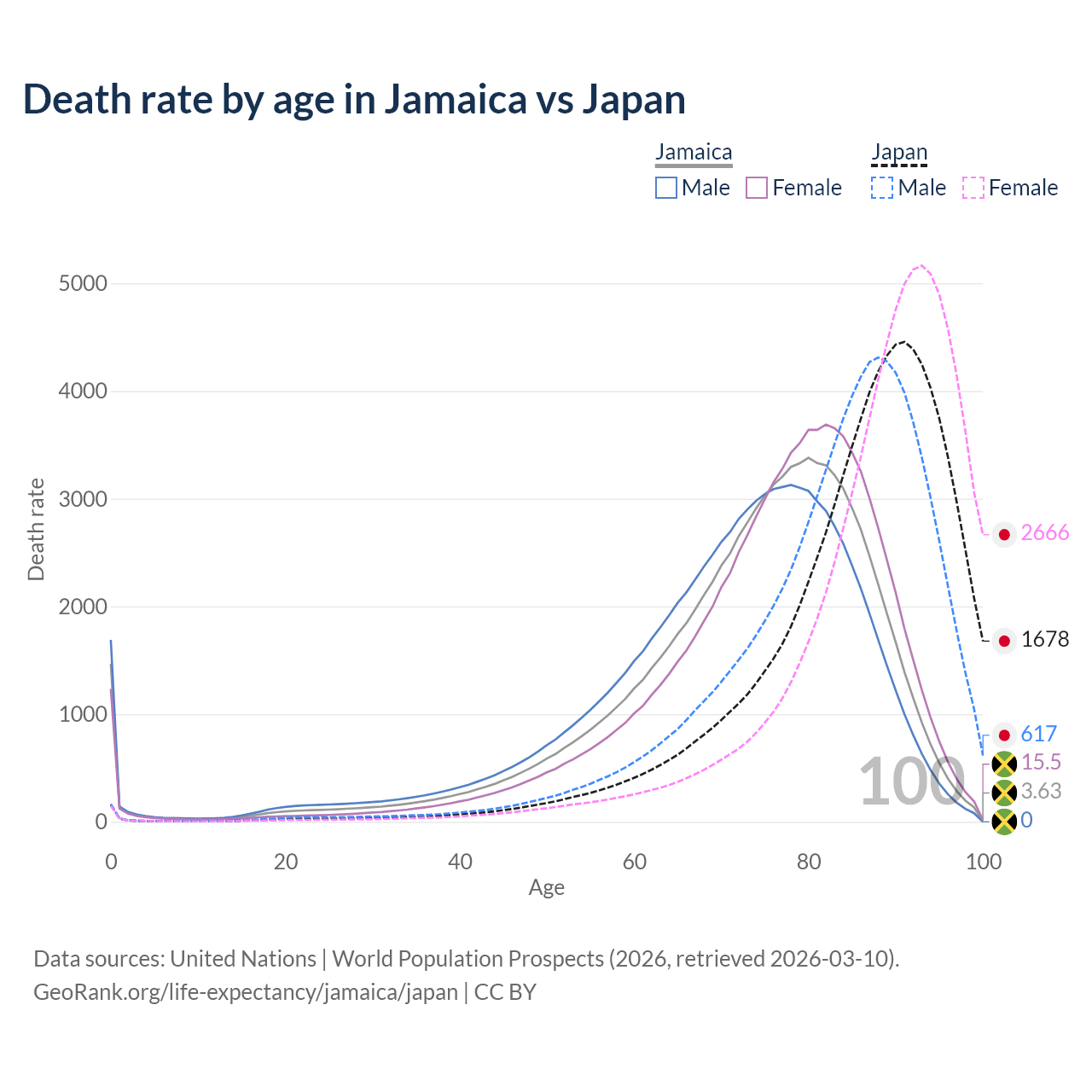 In Jamaica, the most common age of death is 80, compared to 91 in Japan. The median age of death is 75.7 in Jamaica and 88.1 in Japan, meaning only half of each cohort is expected to live past that age.