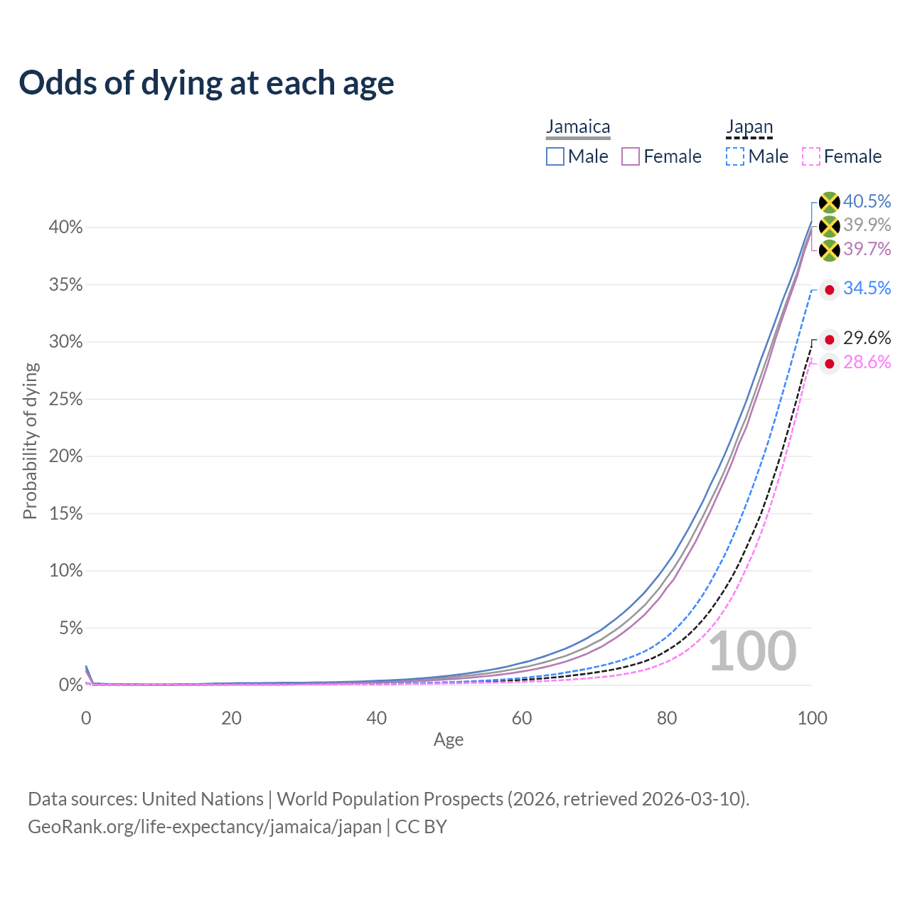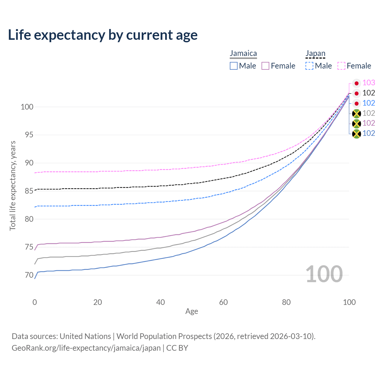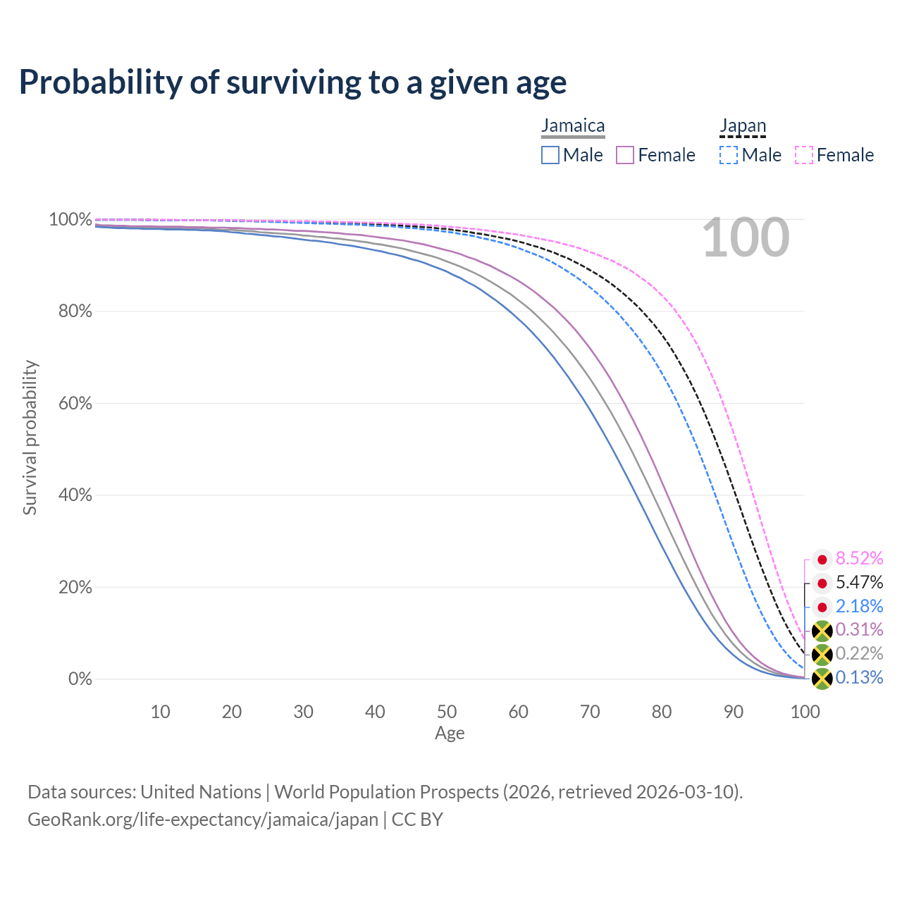 This life expectancy calculator shows the odds of living to 100, 95, 90, and below based on current age for both males and females in Jamaica and Japan, along with mean and median age of death. The calculations are based on the 2026 life tables (actuarial tables) from the UN World Population Prospects.