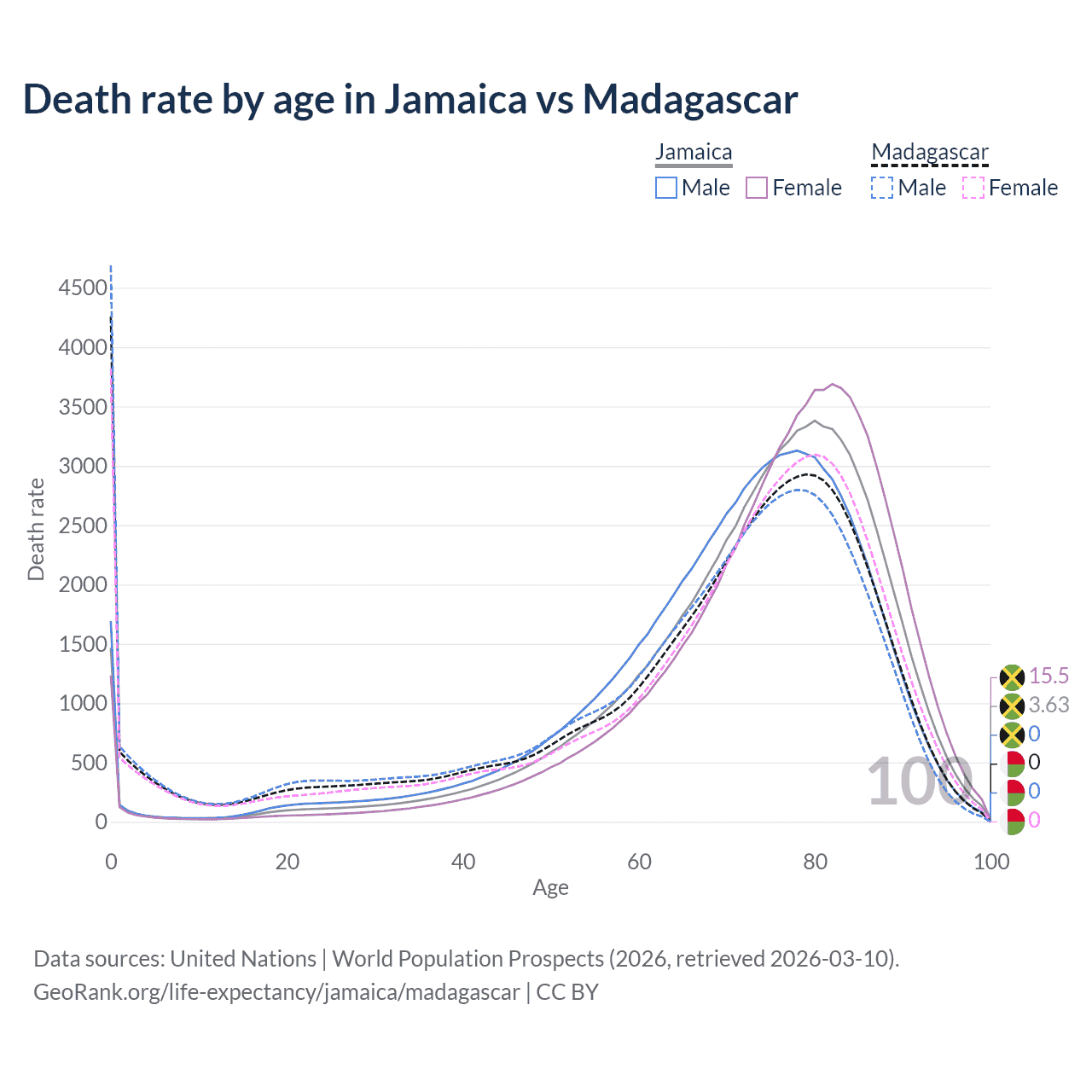In Jamaica, the most common age of death is 80, compared to 0 in Madagascar. The median age of death is 75.7 in Jamaica and 72.2 in Madagascar, meaning only half of each cohort is expected to live past that age.