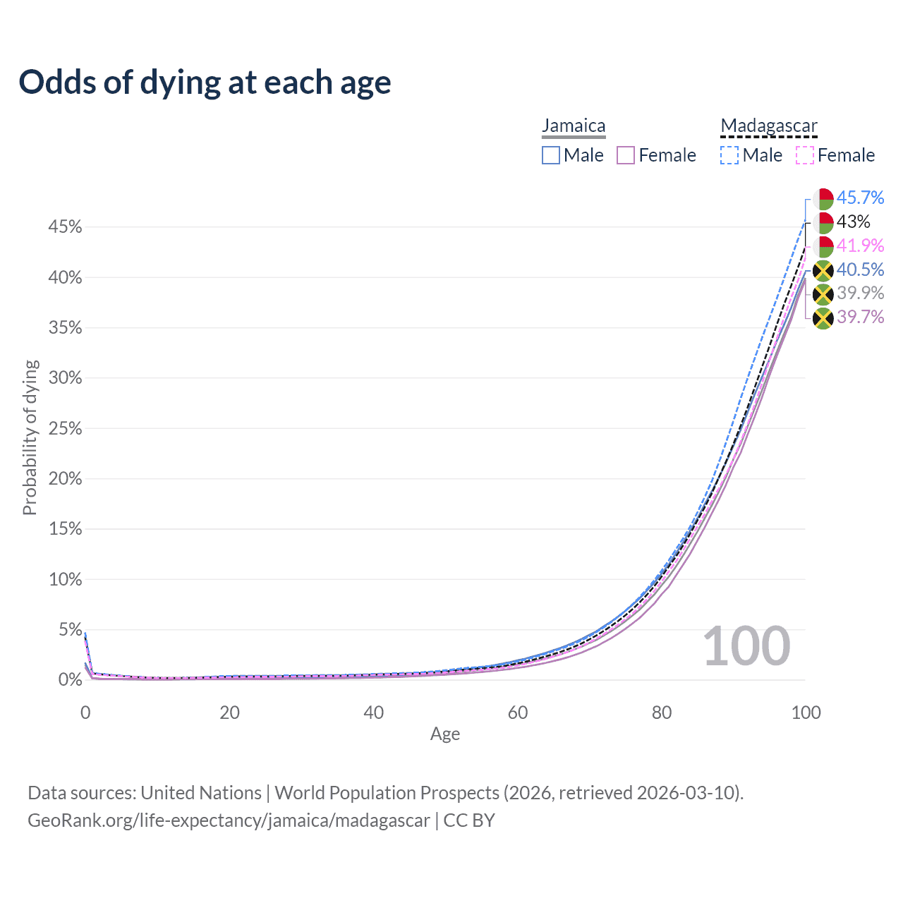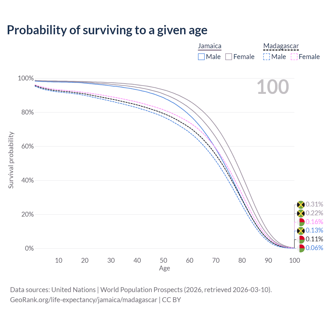 This life expectancy calculator shows the odds of living to 100, 95, 90, and below based on current age for both males and females in Jamaica and Madagascar, along with mean and median age of death. The calculations are based on the 2026 life tables (actuarial tables) from the UN World Population Prospects.