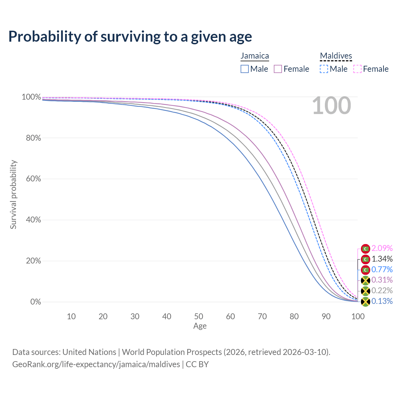 This life expectancy calculator shows the odds of living to 100, 95, 90, and below based on current age for both males and females in Jamaica and Maldives, along with mean and median age of death. The calculations are based on the 2026 life tables (actuarial tables) from the UN World Population Prospects.