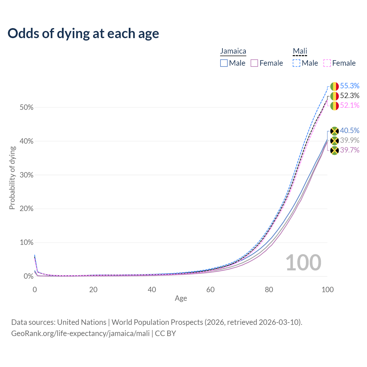 This life expectancy calculator shows the odds of living to 100, 95, 90, and below based on current age for both males and females in Jamaica and Mali, along with mean and median age of death. The calculations are based on the 2026 life tables (actuarial tables) from the UN World Population Prospects.