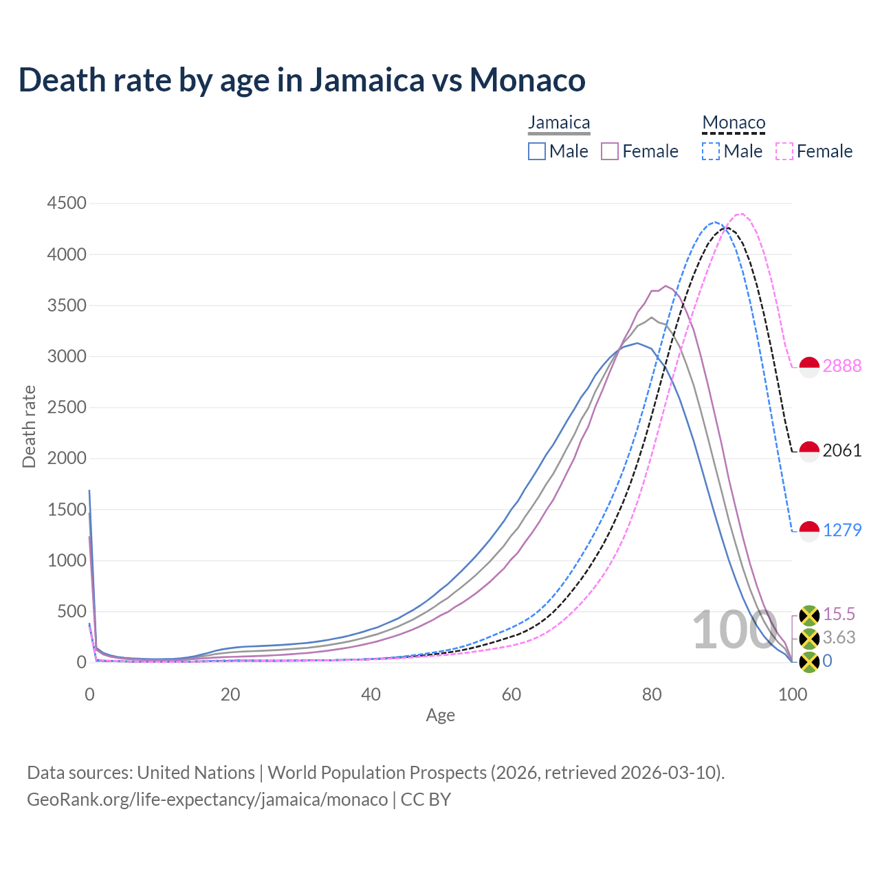 In Jamaica, the most common age of death is 80, compared to 91 in Monaco. The median age of death is 75.7 in Jamaica and 88.7 in Monaco, meaning only half of each cohort is expected to live past that age.