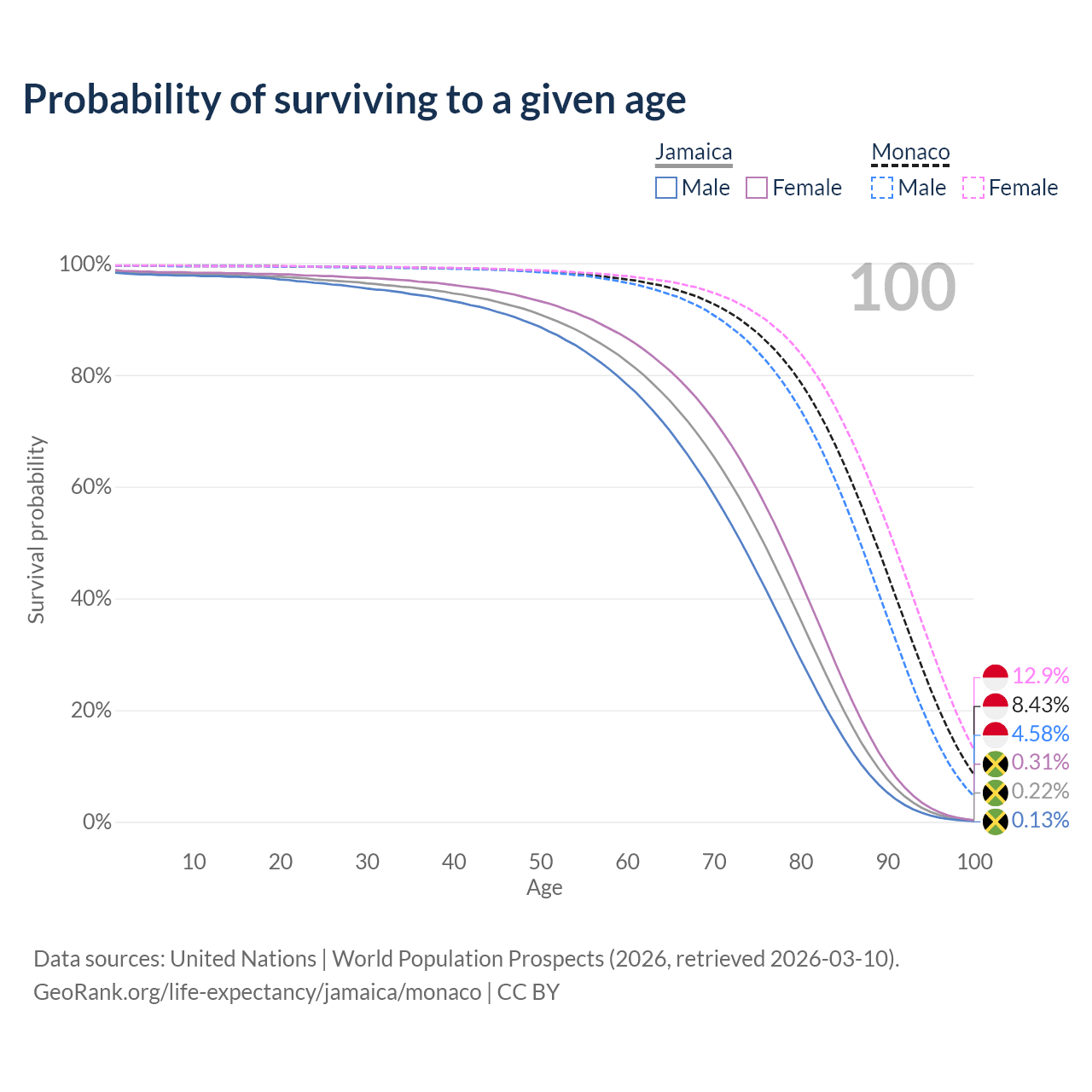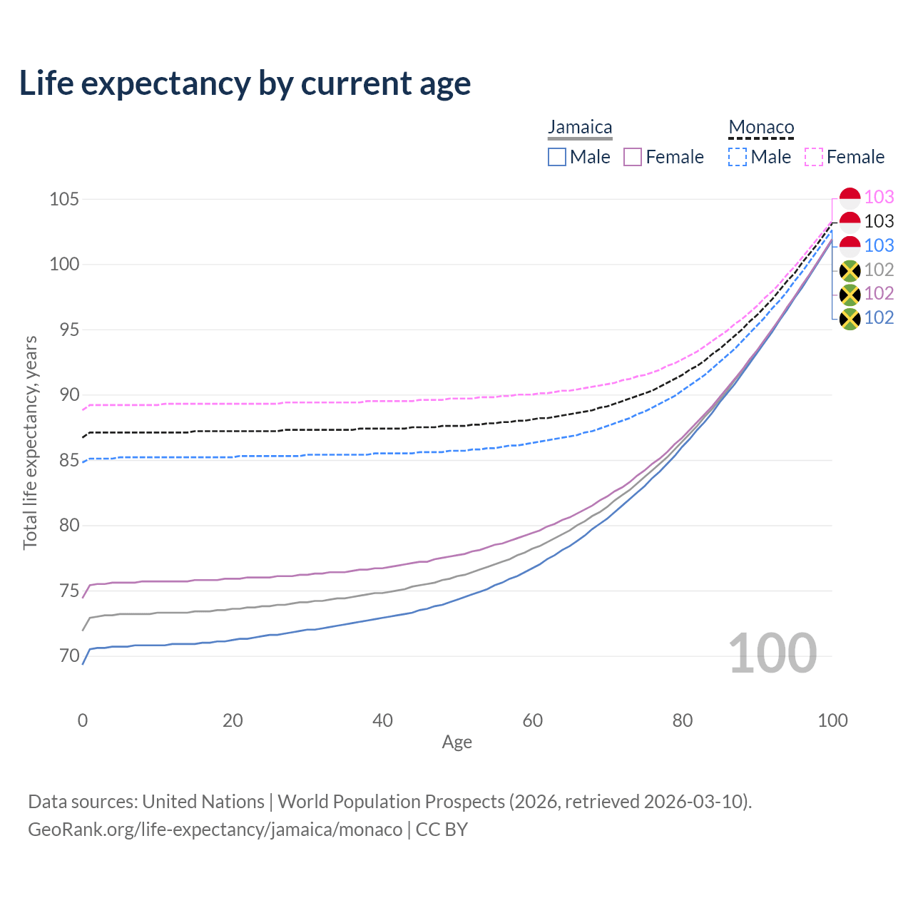 This life expectancy calculator shows the odds of living to 100, 95, 90, and below based on current age for both males and females in Jamaica and Monaco, along with mean and median age of death. The calculations are based on the 2026 life tables (actuarial tables) from the UN World Population Prospects.