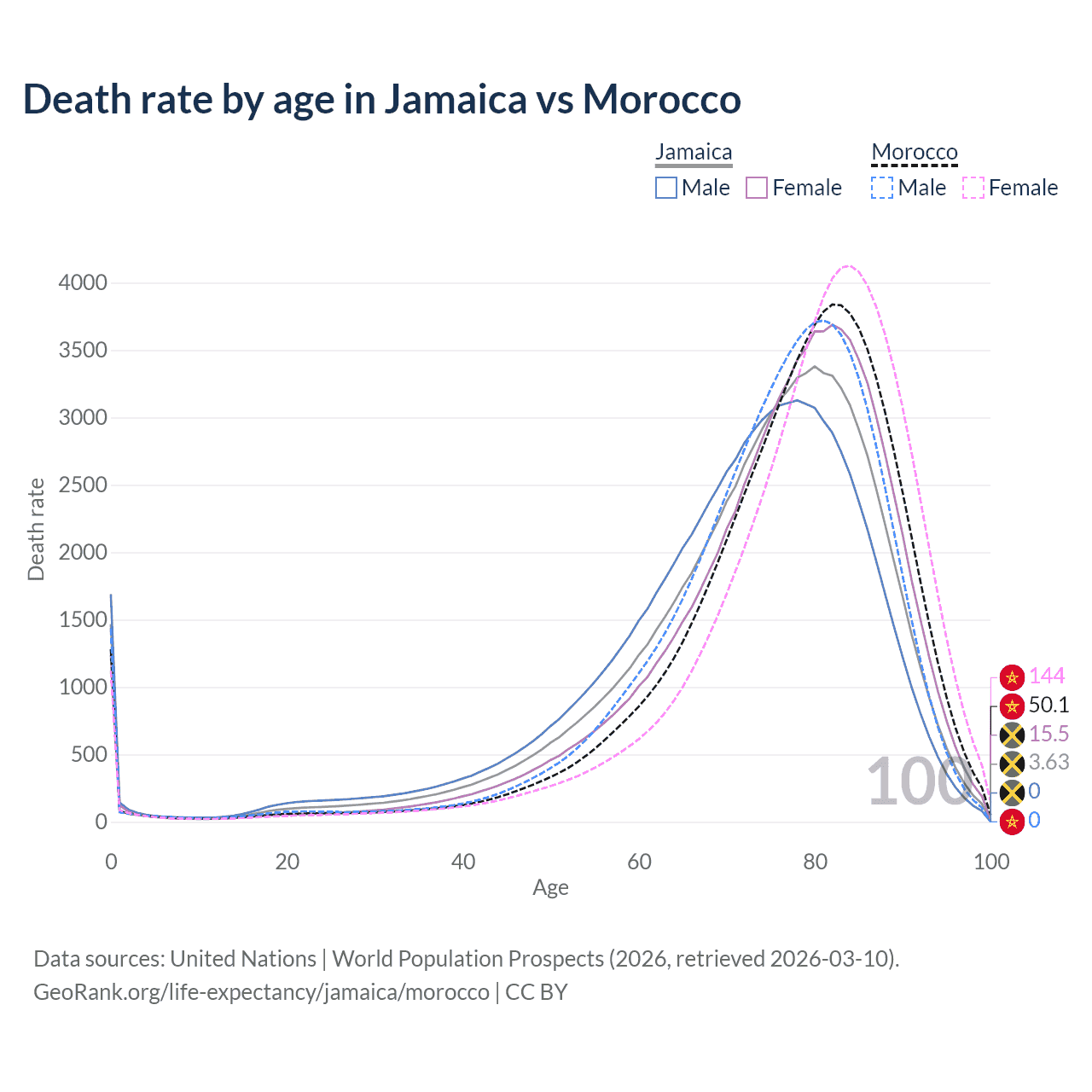 This life expectancy calculator shows the odds of living to 100, 95, 90, and below based on current age for both males and females in Jamaica and Morocco, along with mean and median age of death. The calculations are based on the 2026 life tables (actuarial tables) from the UN World Population Prospects.