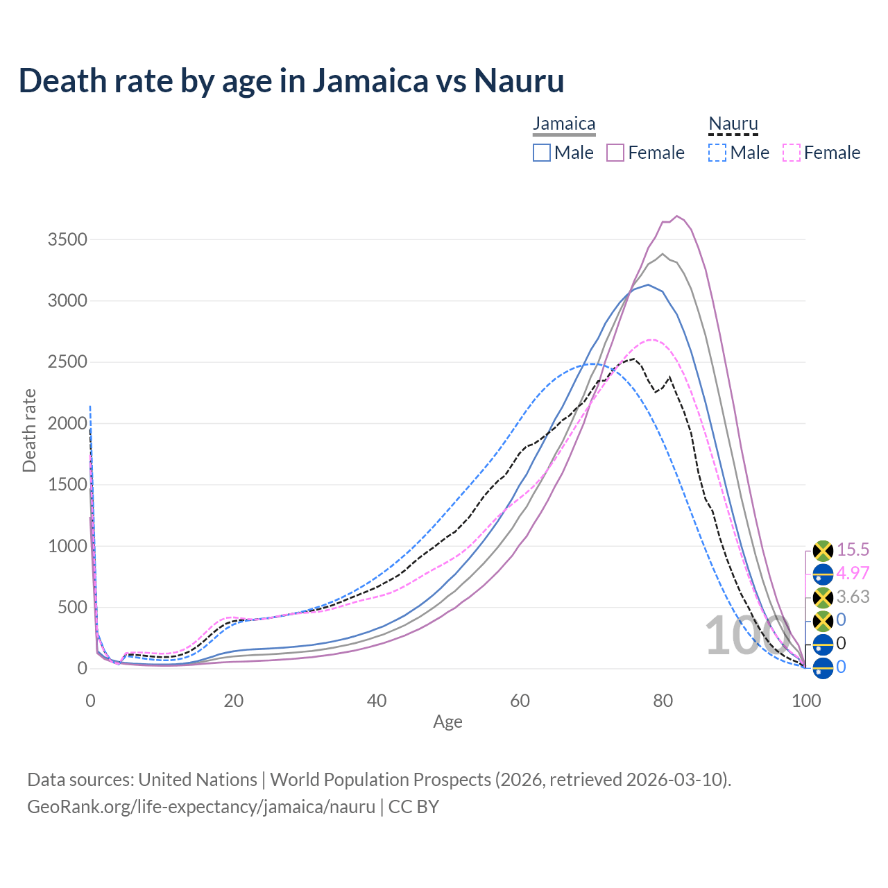 In Jamaica, the most common age of death is 80, compared to 76 in Nauru. The median age of death is 75.7 in Jamaica and 67.3 in Nauru, meaning only half of each cohort is expected to live past that age.