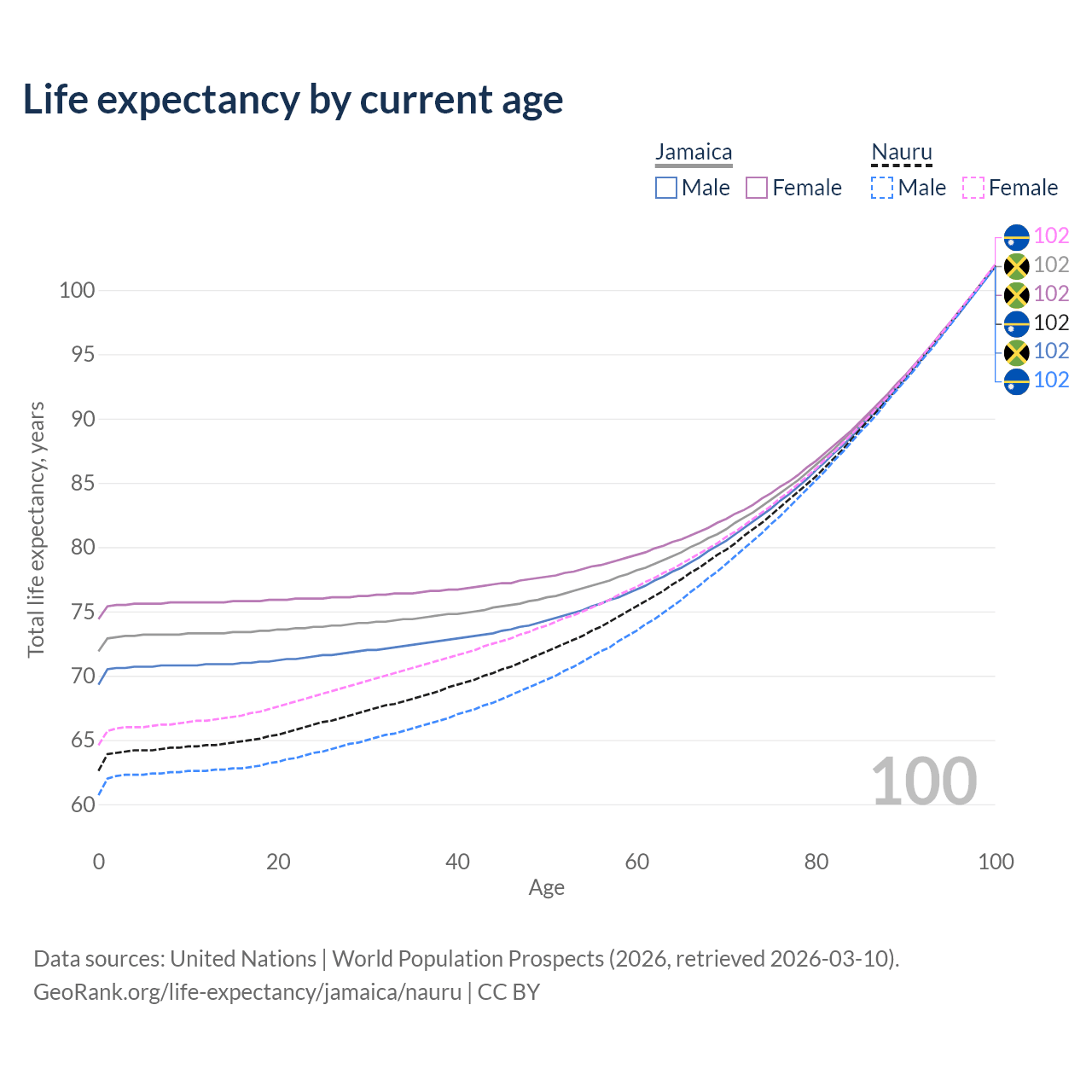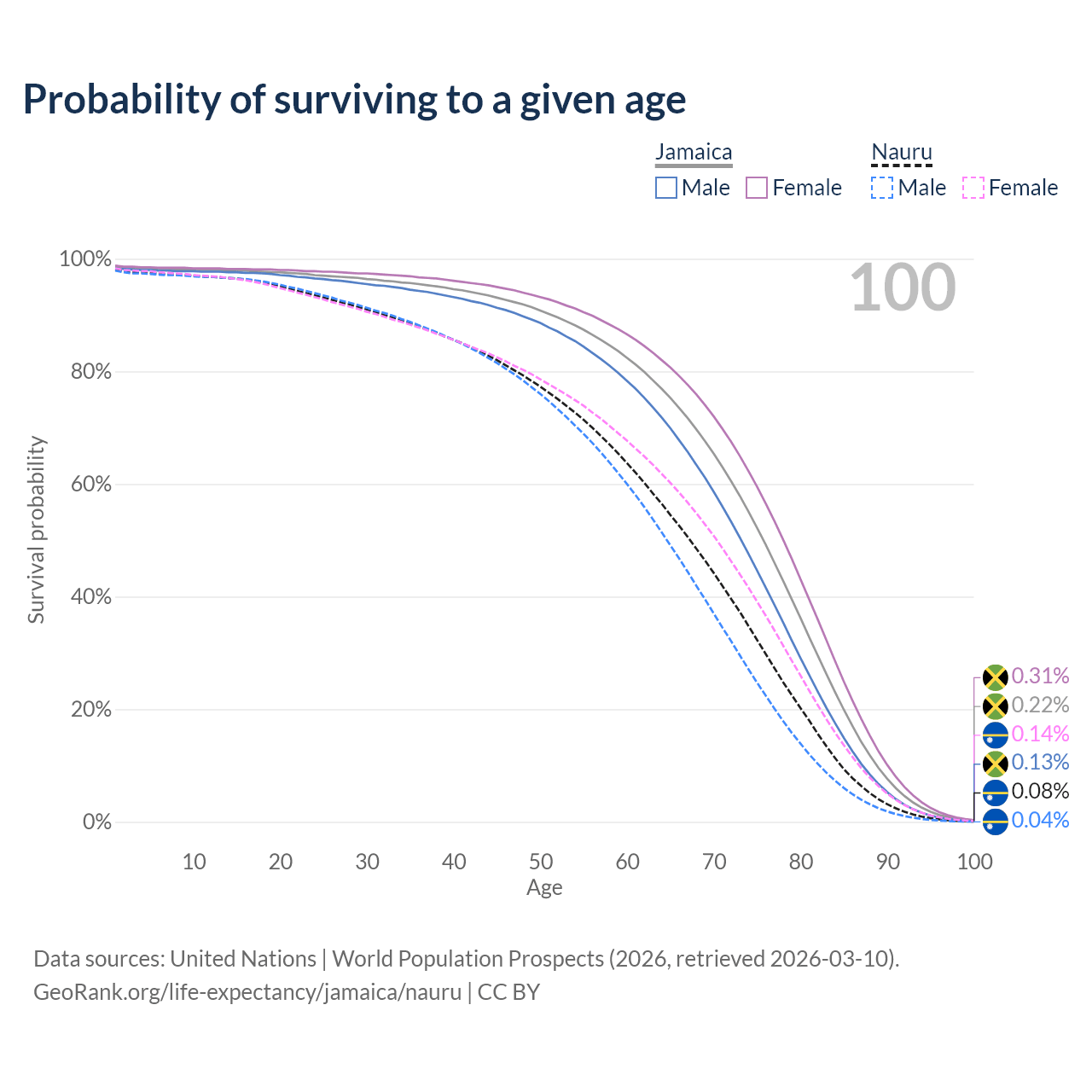 This life expectancy calculator shows the odds of living to 100, 95, 90, and below based on current age for both males and females in Jamaica and Nauru, along with mean and median age of death. The calculations are based on the 2026 life tables (actuarial tables) from the UN World Population Prospects.