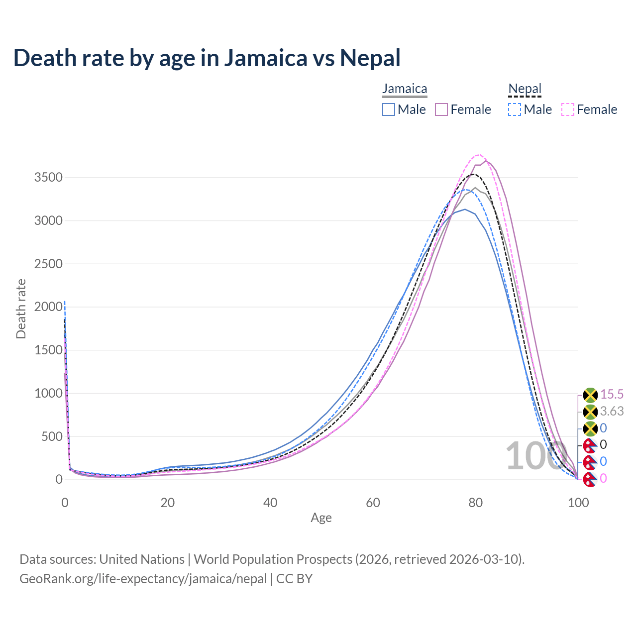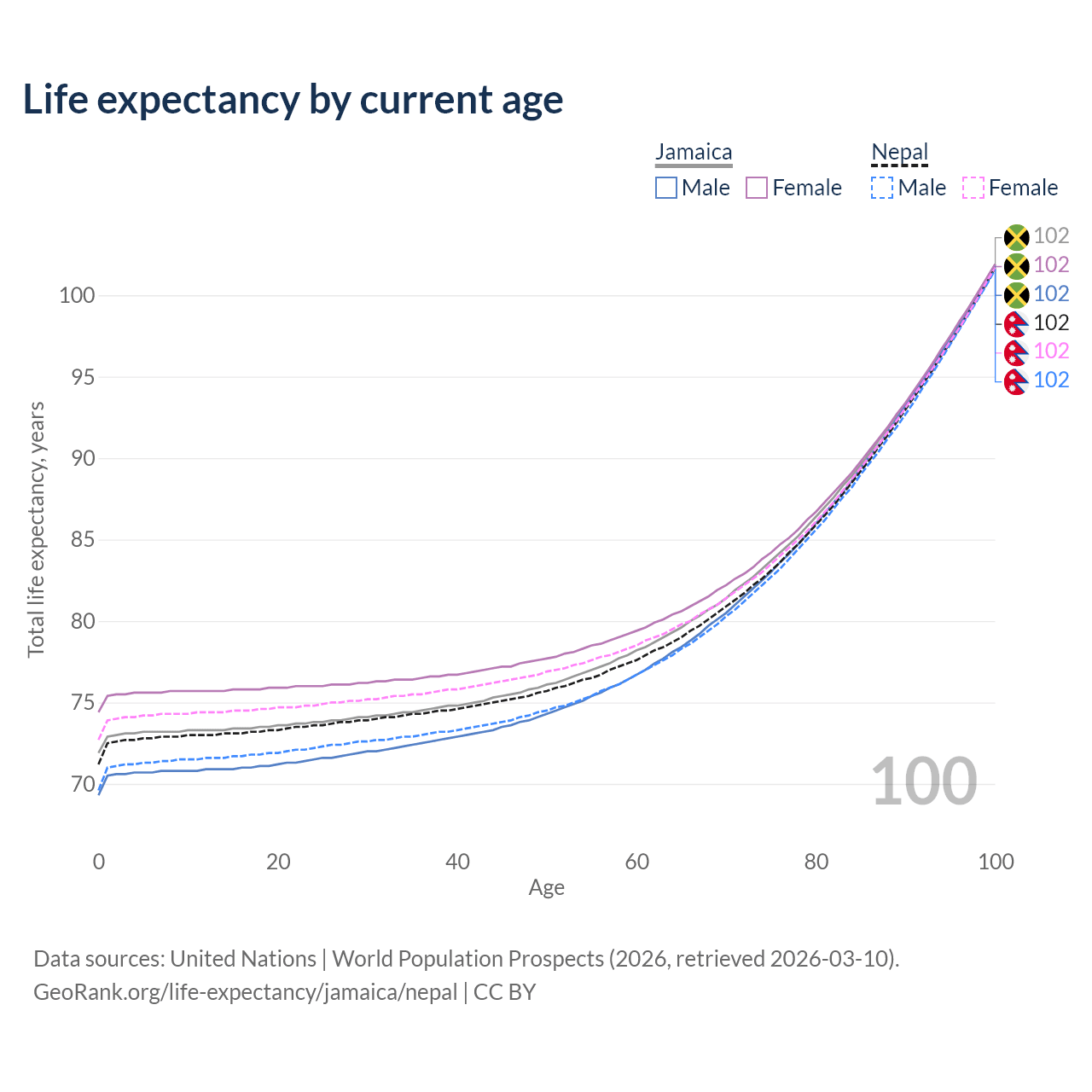 This life expectancy calculator shows the odds of living to 100, 95, 90, and below based on current age for both males and females in Jamaica and Nepal, along with mean and median age of death. The calculations are based on the 2026 life tables (actuarial tables) from the UN World Population Prospects.