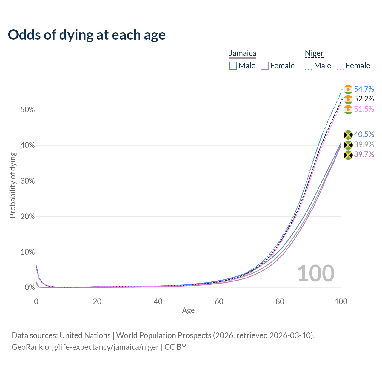 This life expectancy calculator shows the odds of living to 100, 95, 90, and below based on current age for both males and females in Jamaica and Niger, along with mean and median age of death. The calculations are based on the 2026 life tables (actuarial tables) from the UN World Population Prospects.