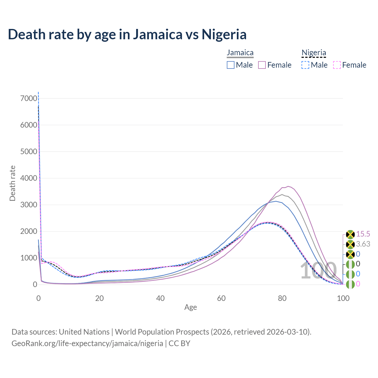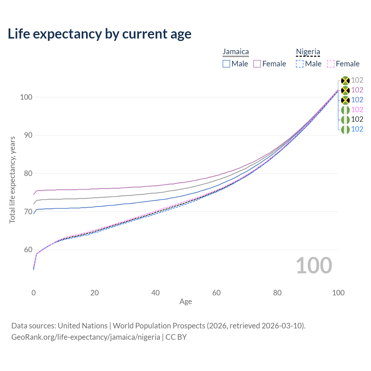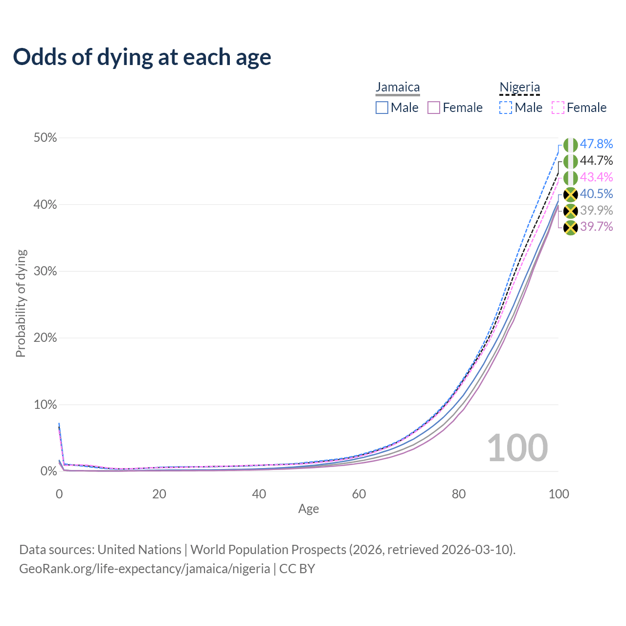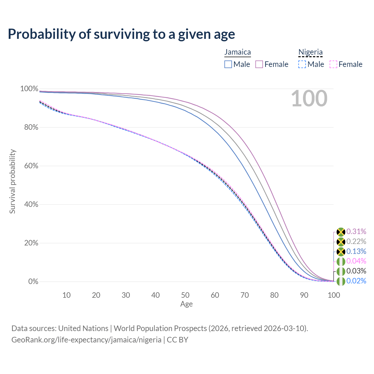 This life expectancy calculator shows the odds of living to 100, 95, 90, and below based on current age for both males and females in Jamaica and Nigeria, along with mean and median age of death. The calculations are based on the 2026 life tables (actuarial tables) from the UN World Population Prospects.