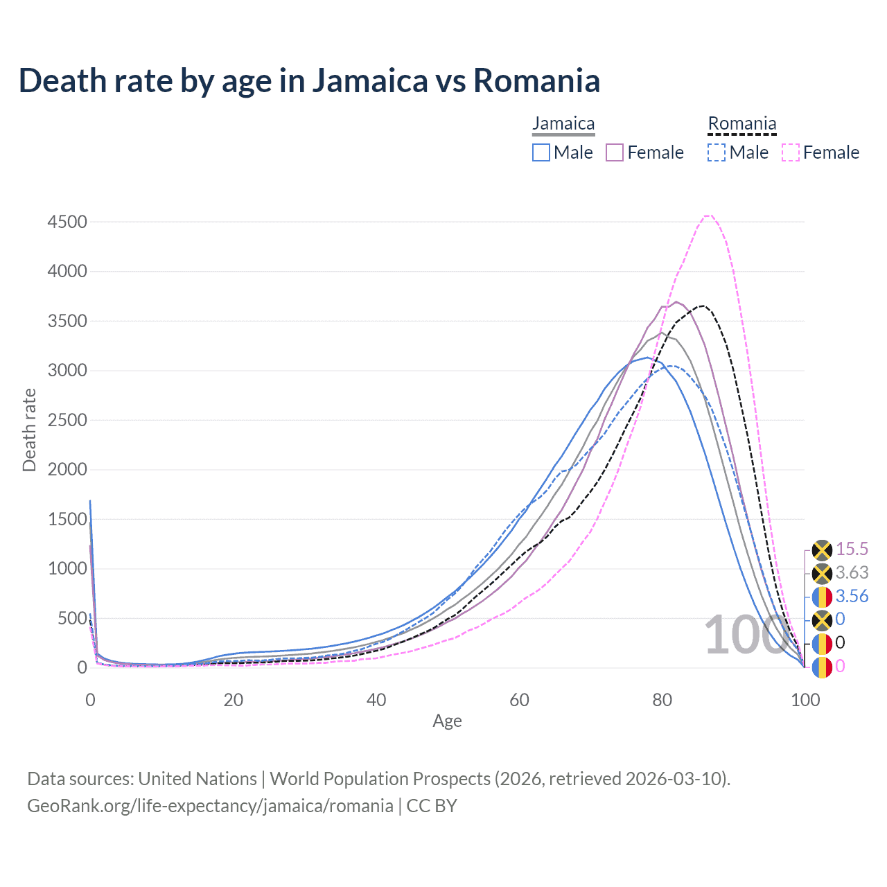In Jamaica, the most common age of death is 80, compared to 86 in Romania. The median age of death is 75.7 in Jamaica and 79.9 in Romania, meaning only half of each cohort is expected to live past that age.