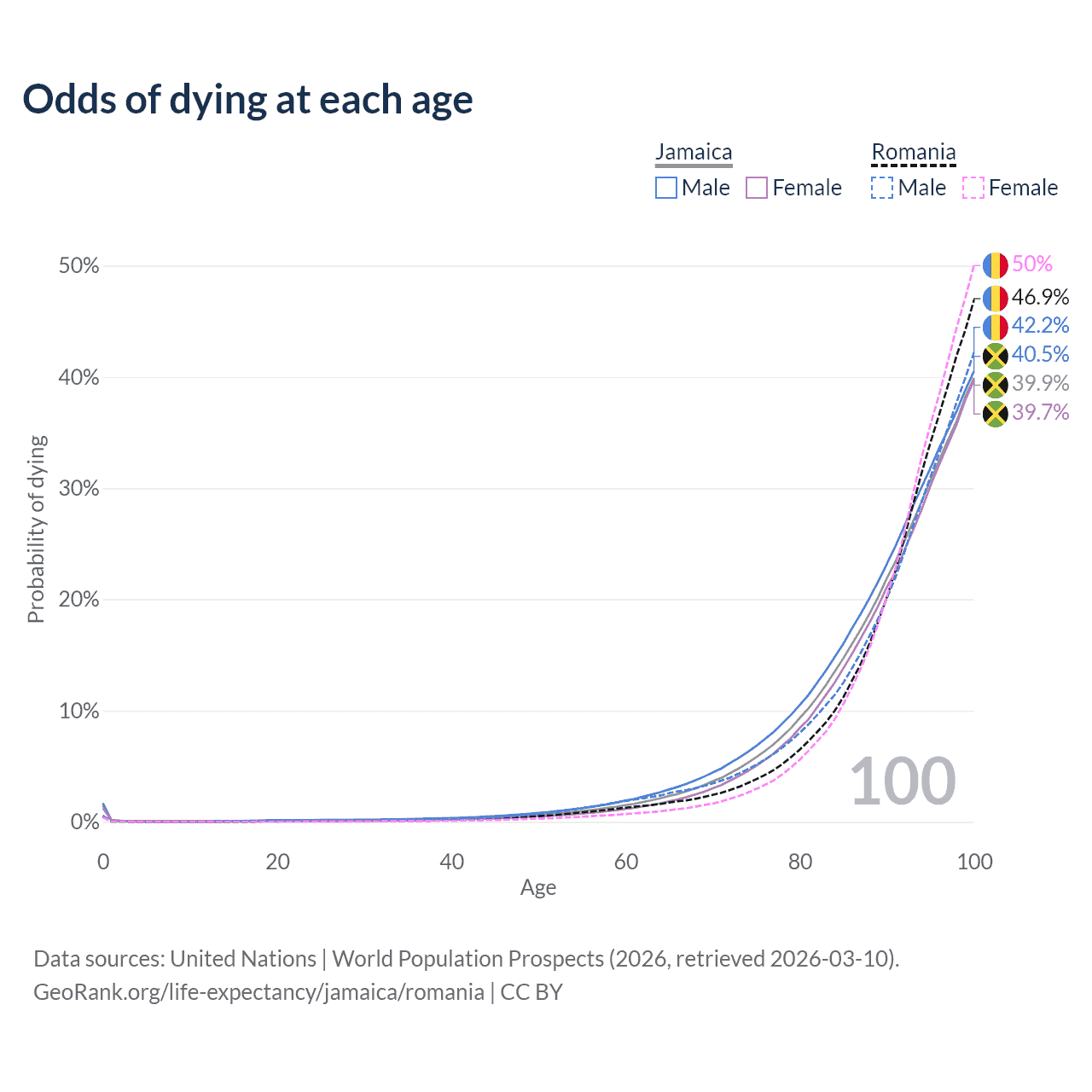 This life expectancy calculator shows the odds of living to 100, 95, 90, and below based on current age for both males and females in Jamaica and Romania, along with mean and median age of death. The calculations are based on the 2026 life tables (actuarial tables) from the UN World Population Prospects.