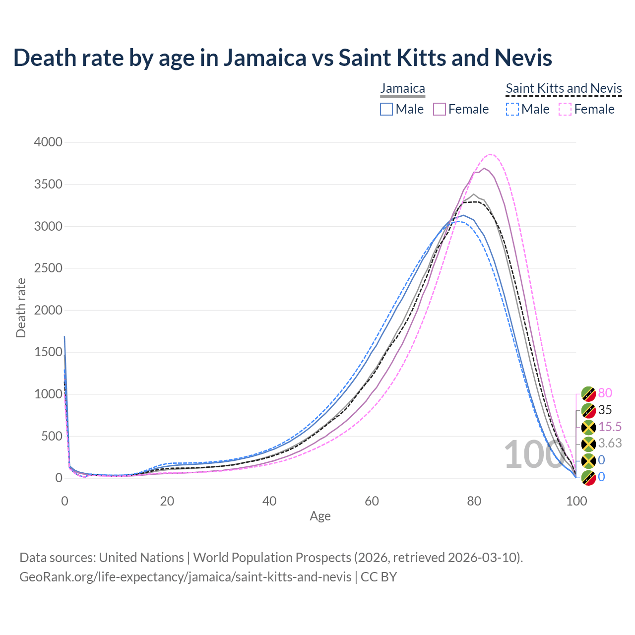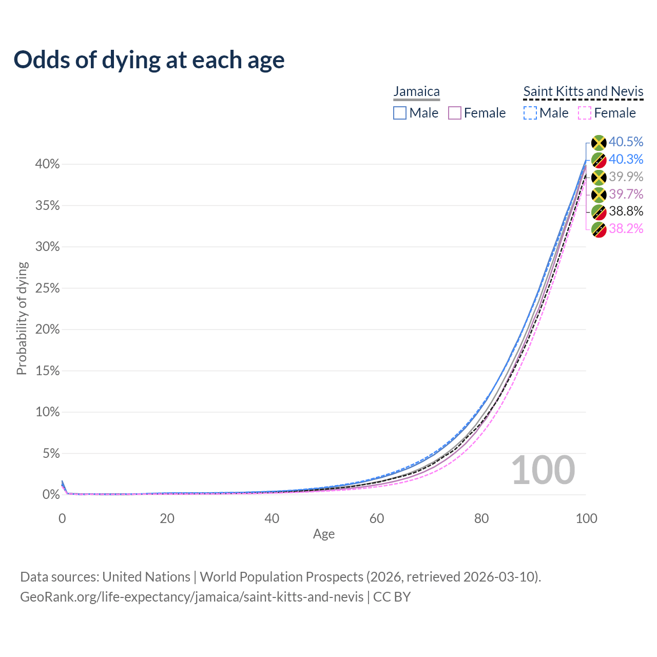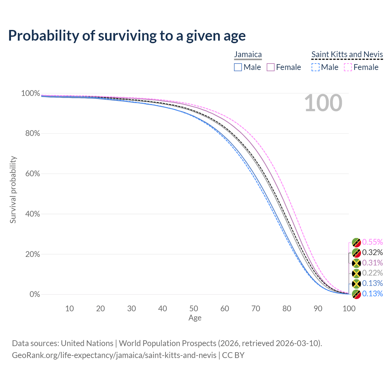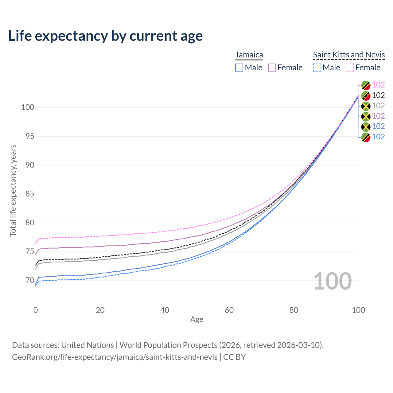 This life expectancy calculator shows the odds of living to 100, 95, 90, and below based on current age for both males and females in Jamaica and Saint Kitts and Nevis, along with mean and median age of death. The calculations are based on the 2026 life tables (actuarial tables) from the UN World Population Prospects.