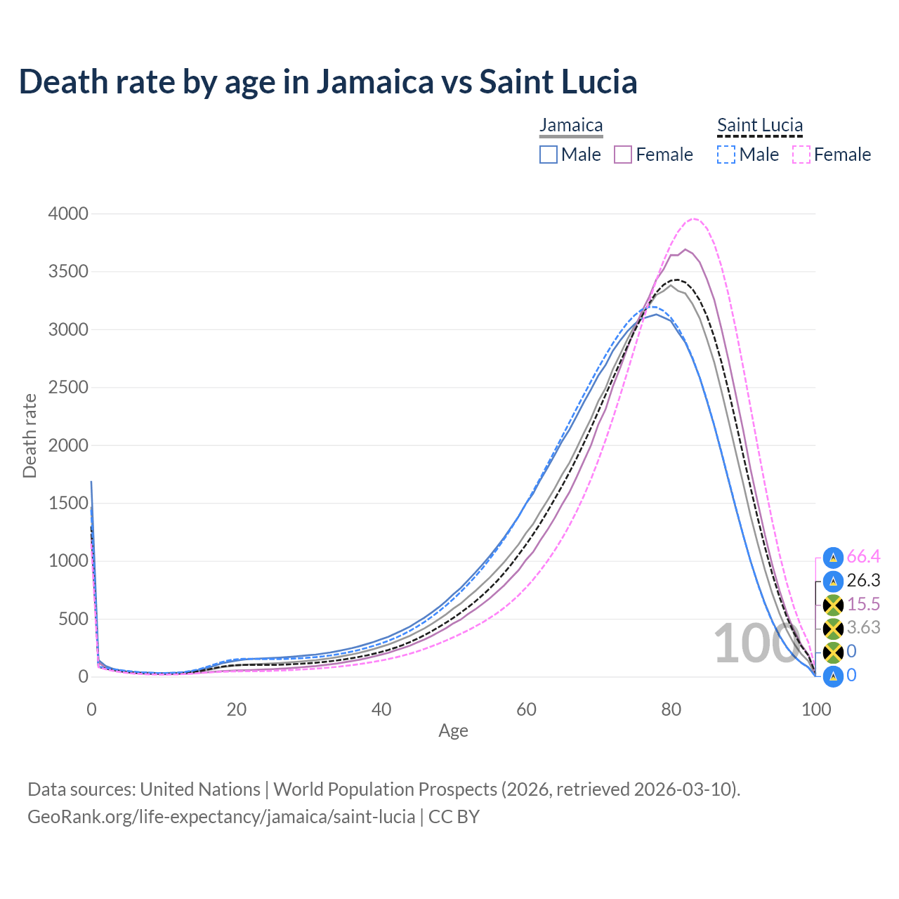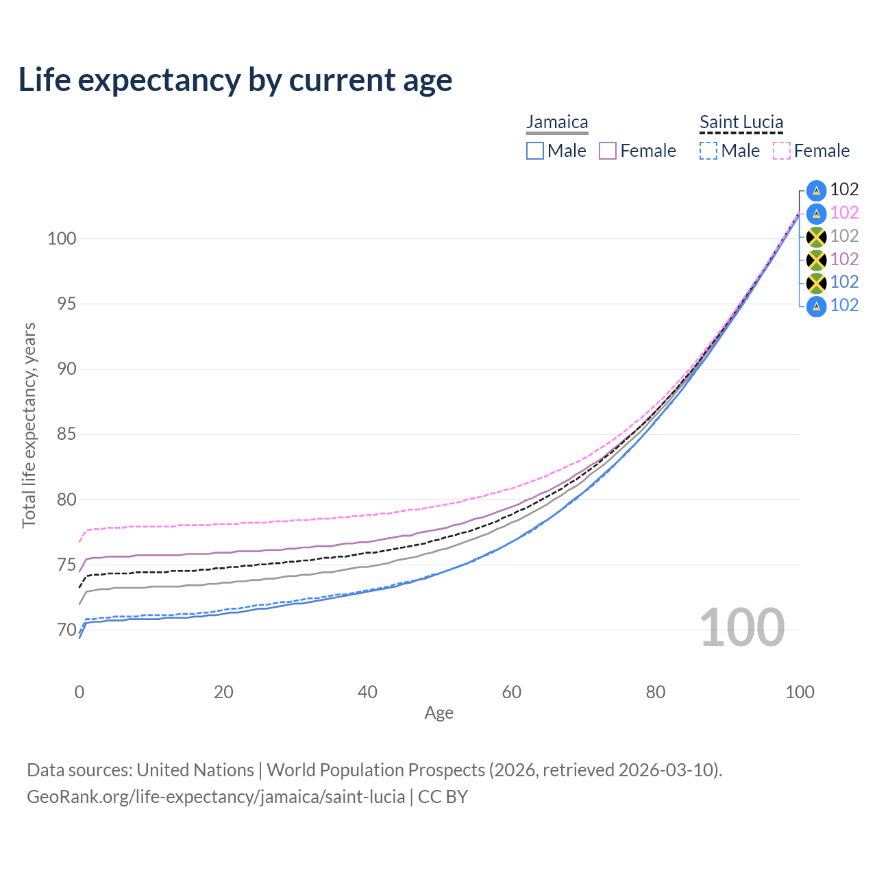 This life expectancy calculator shows the odds of living to 100, 95, 90, and below based on current age for both males and females in Jamaica and Saint Lucia, along with mean and median age of death. The calculations are based on the 2026 life tables (actuarial tables) from the UN World Population Prospects.