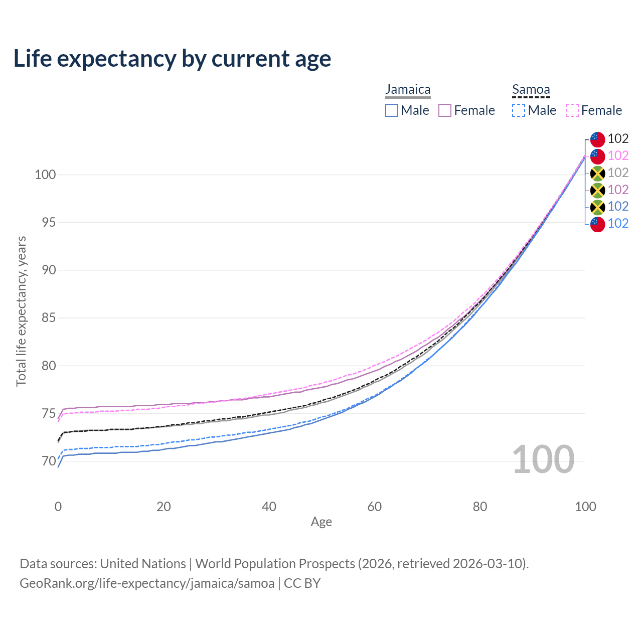 This life expectancy calculator shows the odds of living to 100, 95, 90, and below based on current age for both males and females in Jamaica and Samoa, along with mean and median age of death. The calculations are based on the 2026 life tables (actuarial tables) from the UN World Population Prospects.