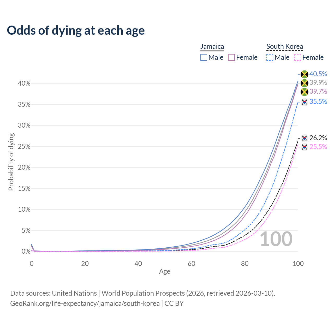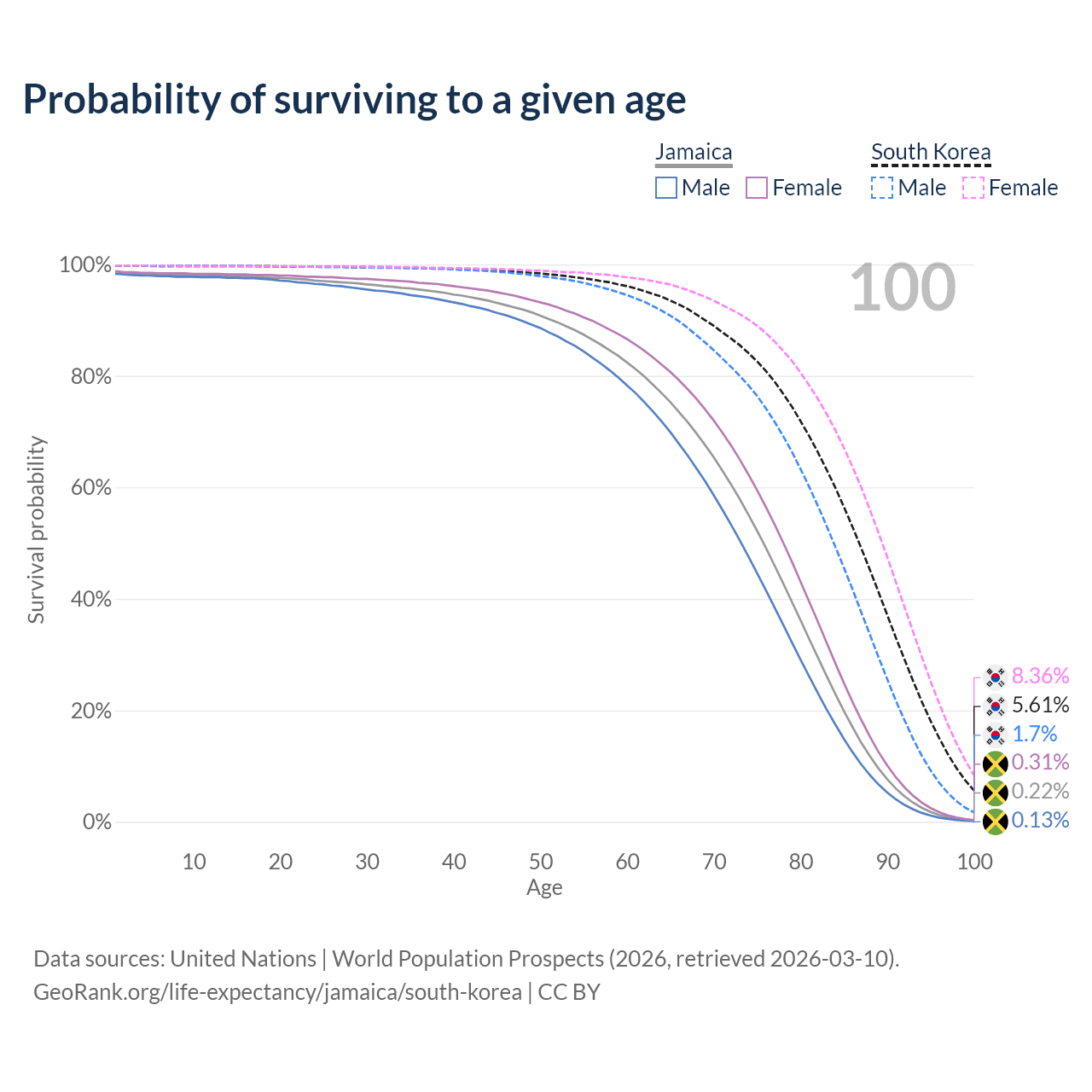 This life expectancy calculator shows the odds of living to 100, 95, 90, and below based on current age for both males and females in Jamaica and South Korea, along with mean and median age of death. The calculations are based on the 2026 life tables (actuarial tables) from the UN World Population Prospects.